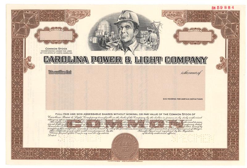 [Specimen] ----, North Carolina. Stock certificate specimen in Carolina Power & Light Company. Brown / Black. Vignette of various CP & L employees at top center. Perforation cancellation at bottom edge. Very Fine.