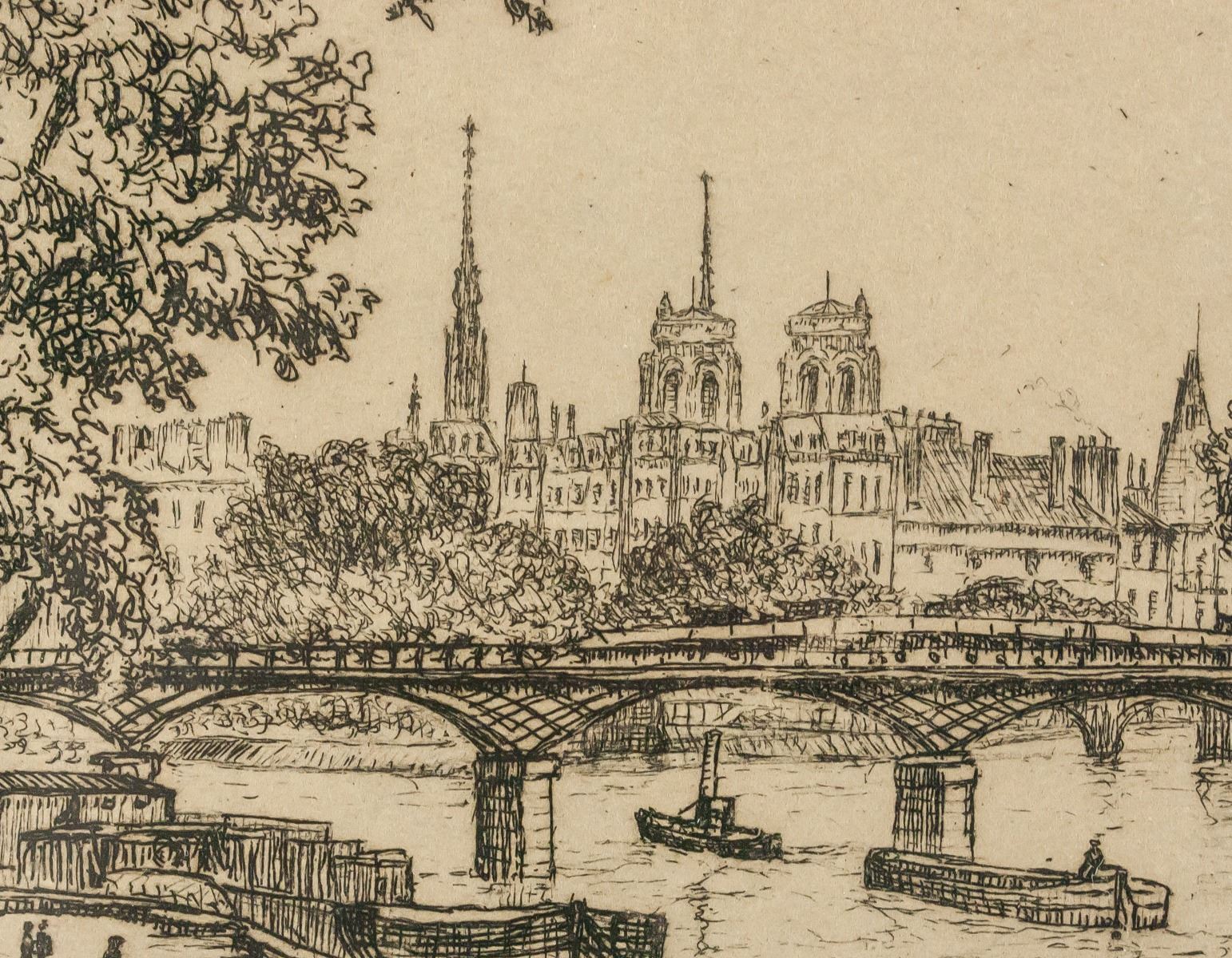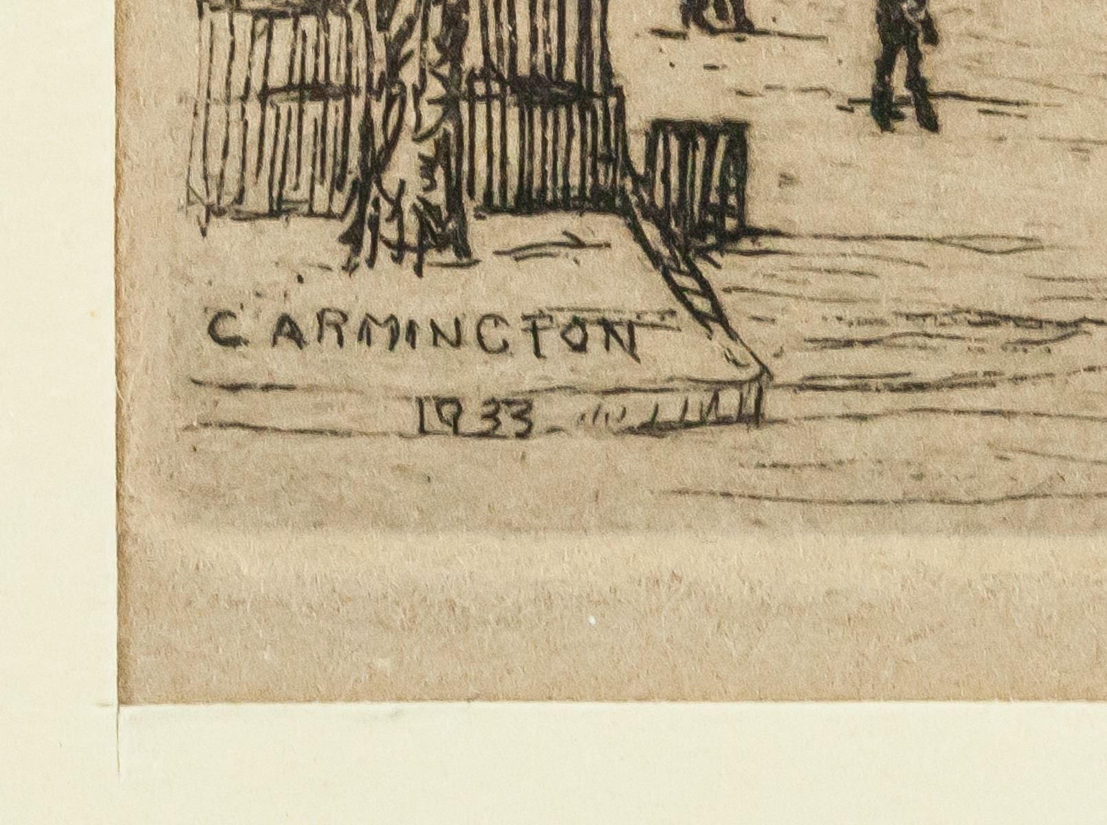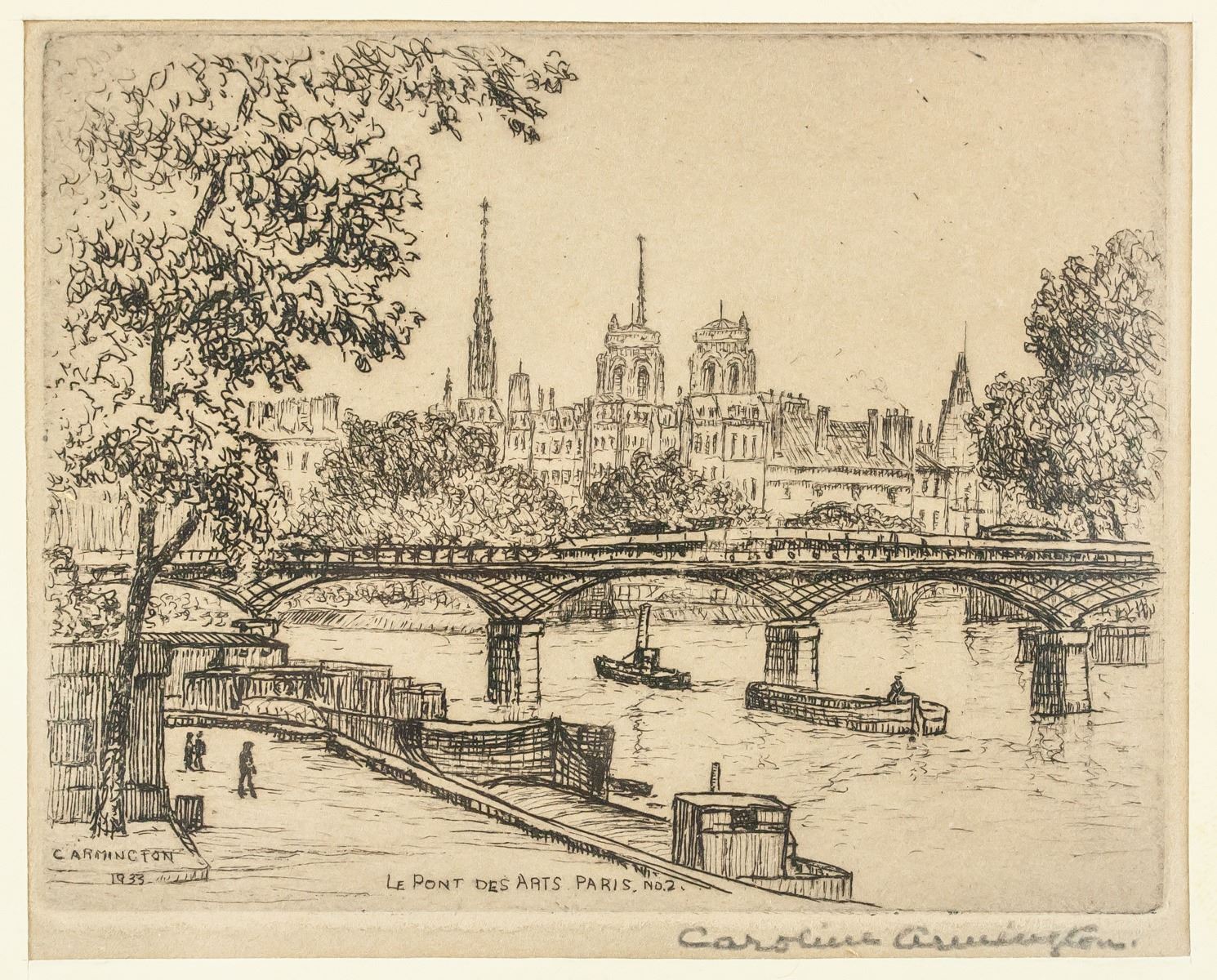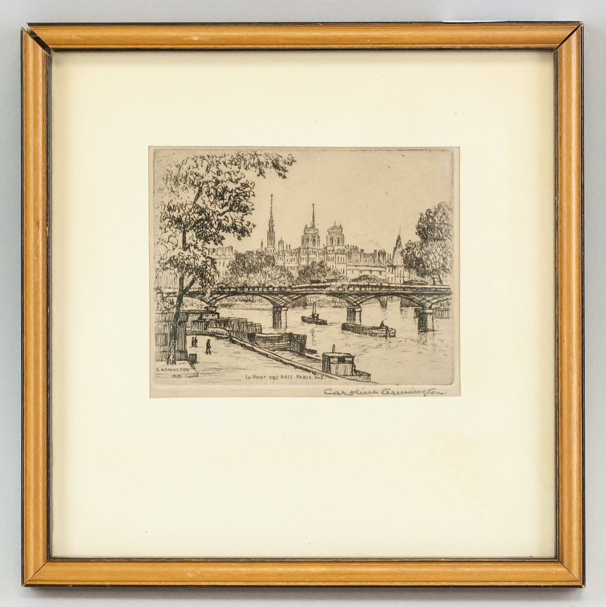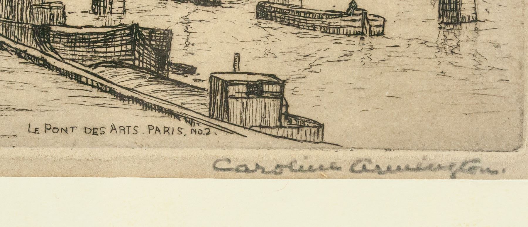 Lithograph on paper, framed. Featuring Parisian scene. "Le Pont Des Arts Paris No. 2" printed in the bottom center. "C. Armington 1933" printed in the bottom left corner. Signed by Caroline Armington (1875-1939, Canadian) on the lower right corner, in pencil. Label affixed to verso reads "Pictures & Framing / Order No. 2874 / Date: 5/2/38 / The RIKE-KUMLER COMPANY" 8 x 9.5 cm (3 x 3.7 inches), framed: 18 x 18 cm (7 x 7 inches)