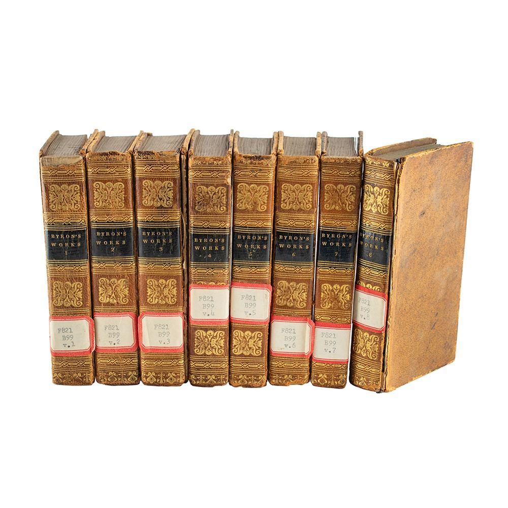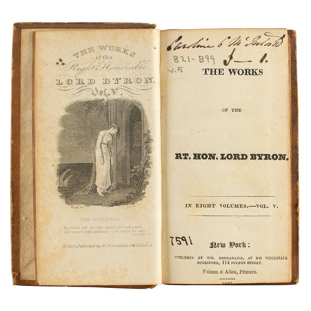 Signed book set: The Works of the Rt. Hon. Lord Byron, Vol. 1–8. NY: William Borradale, 1825. Hardcovers bound in full morocco, 3 x 5.25, totaling 2,680 pages. Signed on an opening page of each volume in ink, "Caroline C. McIntosh." This set reproduces the entire oeuvre of Lord Byron, ranging from epic poems like Childe Harold's Pilgrimage and Don Juan, to individual poems from the Hebrew Melodies. Each volume contains a frontispiece engraving illustrating one of his works. Autographic condition: fine. Book conditions: VG/None, with repairs to detached covers to Volumes III and VIII, scattered foxing, various inventory notations, and isolated closed tears and loss to corners and edges. Deaccessioned from the Buffalo and Erie County Historical Library, the institution founded by Millard and Abigail Fillmore.