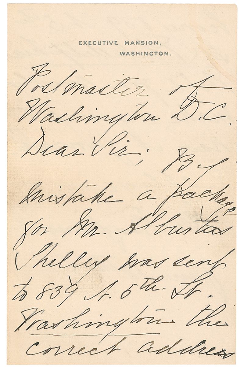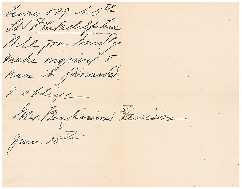 Rare ALS signed “Mrs. Benjamin Harrison,” one page both sides, 4 x 6, Executive Mansion letterhead, June 18 [1891]. Letter to the Postmaster of Washington, D. C. In full: “By mistake a package for Mr. Alburtus [sic] Shelley was sent to 839 N. 5th St. Washington the correct address being 839 N. 5th St. Philadelphia. Will you kindly make inquiry & have it forwarded & oblige.” In fine condition, with some light soiling to first page and a couple trivial brushes to signature.