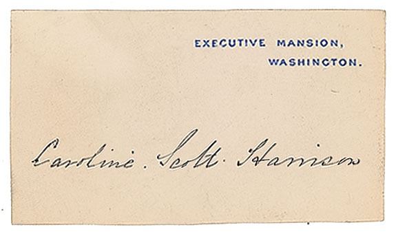 Executive Mansion card, 3.5 x 2, signed in black ink, "Caroline Scott Harrison." In fine condition, with trimmed edges.