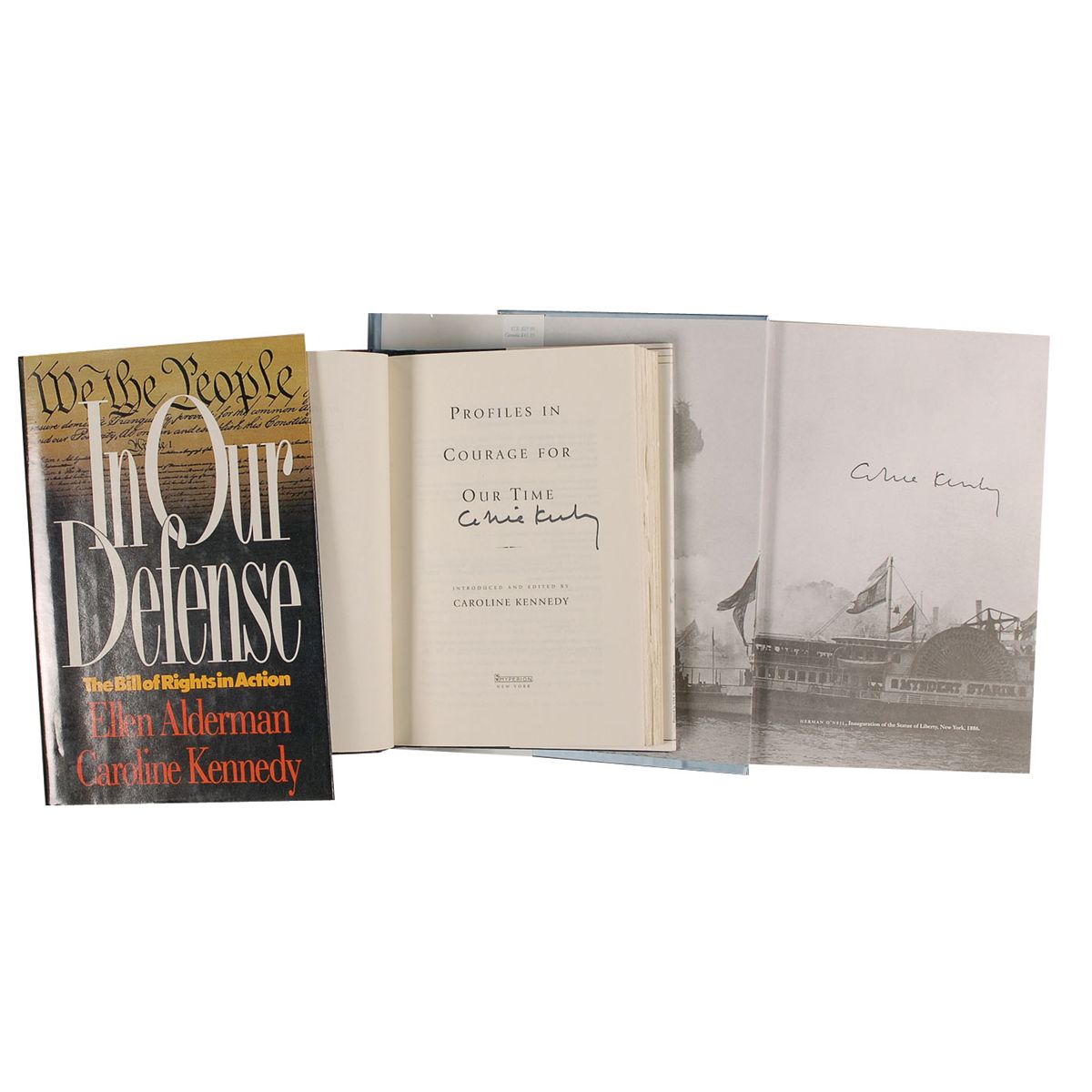 Three hardcover books: Profiles in Courage for Our Time, signed in black felt tip on the title page; In Our Defense: The Bill of Rights in Action, signed in blue felt tip on the first free end page, beneath a printed replica of the Bill of Rights by Kennedy and co-author, Ellen Alderman; and A Patriot’s Handbook, signed in black felt tip on the first free end page. In fine condition.