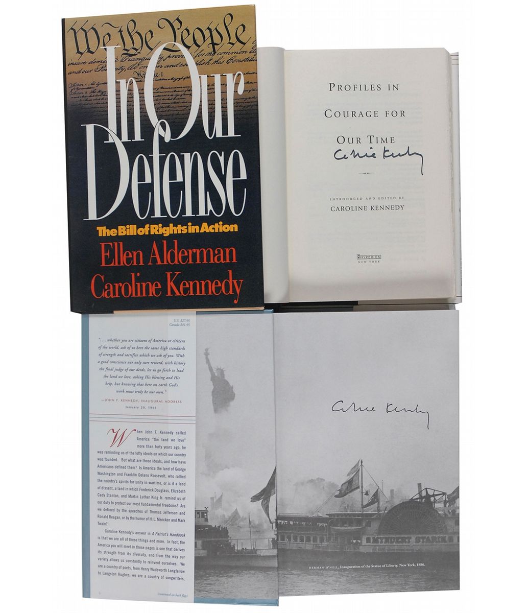 Three hardcover books: Profiles in Courage for Our Time, signed in black felt tip on the title page; In Our Defense: The Bill of Rights in Action, signed in blue felt tip on the first free end page by Kennedy and co-author, Ellen Alderman; and A Patriot’s Handbook, signed in black felt tip on the first free end page. In fine condition.