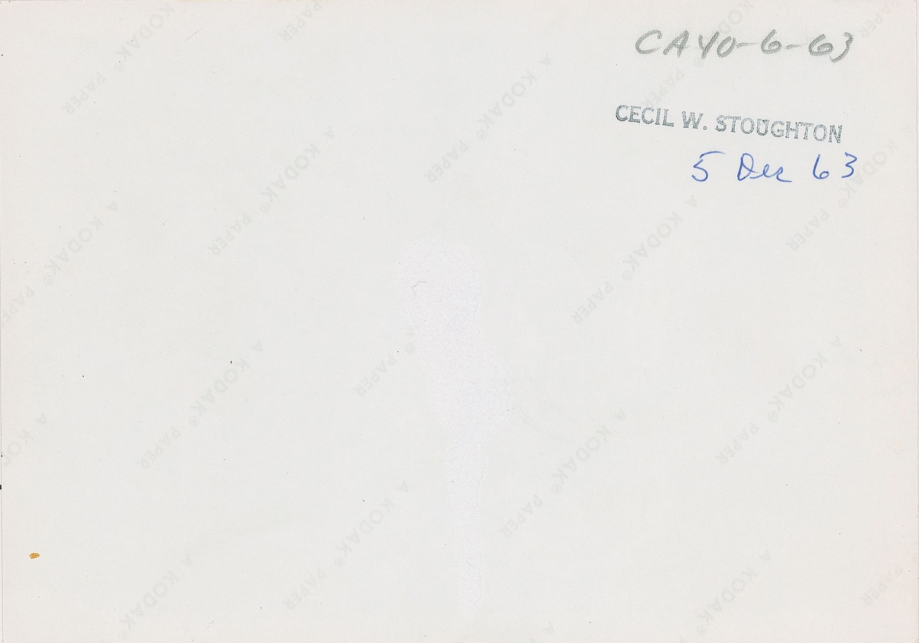 Cecil Stoughton's own original vintage color glossy 7 x 5 photo of a joint birthday party for Caroline and JFK, Jr. on December 5, 1963, taken by official White House photographer Cecil W. Stoughton. This was the family's last day in the White House, two weeks after the assassination of President Kennedy: in this rare image, Caroline is seen with a white hairpiece in the background, and John John is receiving a gift from his mother on the right side of the frame. Reverse bears "A Kodak Paper" watermarks, a "Cecil W. Stoughton" ink stamp, and ink and pencil notations, "CA40-6-63, 5 Dec 63." In fine condition, with some minor surface loss on the back. From the collection of Cecil W. Stoughton.