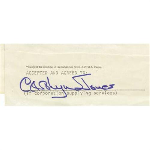 <B>Carolyn Jones Signed Contract.</B></I> A standard AFTRA engagement contract dated September 29, 1965, with attached rider, engaging the actress to appear as a guest host on the variety show <I>Shindig,</B></I> signed by her and initialed twice in blue ink. In Very Fine condition with mild overall wear and tanning, some staple and binder holes, and a heavy fold crease. <I>Accompanied by LOA from PSA/DNA.</B></I><BR><BR><b>Shipping:</b> Flat Material, Small (<a target="_blank" href="http://www.heritageauctions.com/common/shipping.php">view shipping information</a>)