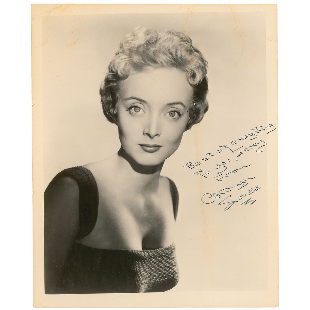 Vintage glossy 8 x 9.75 photo of Jones, signed and inscribed in fountain pen, “Best of everything to you, Jerry, from Carolyn Jones.” In very good condition, with a large vertical crease to right portion, dings to left edge, and toning to scattered creases.