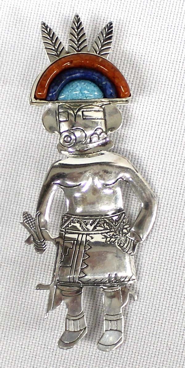 Carolyn Pollack Sterling Kachina Pin Pendant, overlay of turquoise, lapis, and coral, hallmarked and stamped sterling, measures 2.5'' x 1''
