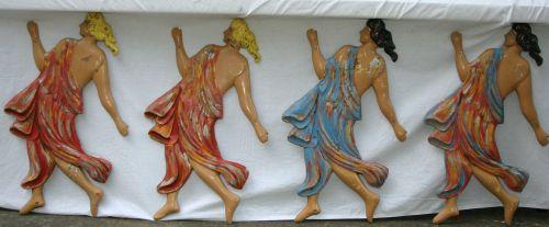 Eight festive, colorful aluminum female figures in classical dress that once graced the facade of a carousel. Some chipped paint. Approximately 16" x 28" high.