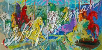 In Carousel Neiman's powerful brush stroke and kaleidoscopic palette captures our imagination. His fanciful, magical, mythical wooden horses burst from the picture plane. Horses in greens, blues, oranges, yellows and reds leap round and round. With their long noble heads, aristocratic bone structure and agility they combine majesty, grace and power. The serigraph pulsates with energy inviting us to mount the steeds and gallop away. Artist: LeRoy Neiman Autograph: N/AMedium: Serigraph - Limited EditionEdition Size: 450Year: 2006COA: AllstarsArtDimensions: 19" x 38" (48.3 x 96.5 cm)Retails: $4,215LeRoy Neiman is certainly one of our most popular and prolific contemporary artists. His work consistently garners popular praise and critical acclaim. This is an exciting work by the man who has transformed "sports art" into "fine art."