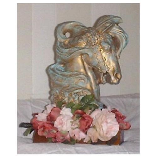 This is a beautiful Carousel horse head, surrounded by pink, dusty pink, and mauve silk flowers. The head is made of plaster mounted on a thick wood base. The horse head is painted in a verte d'gris (green patina over gold). It measures 16 inches tall by 10 inches wide.<p>We would be glad to answer any questions.