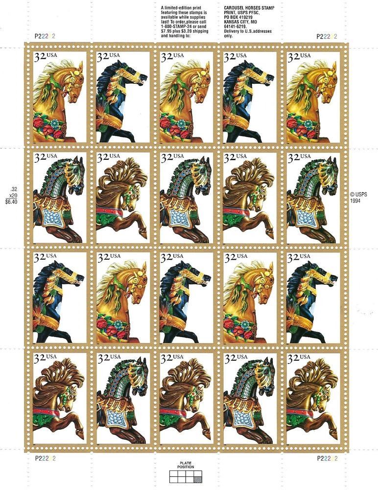 Carousel Horses 20 x 32 Cent U.S. Postage Stamps 1995. The stamps were issued on July 21, 1995, in Lahaska, Pennsylvania. At the suggestion of artist Paul Calle, the first day ceremony was held at the Carousel World Museum.