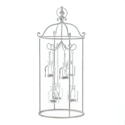 Carousel Mini Bottle Candleholder **|**|** A captivating carousel of light and charm, this cottage white candleholder is the perfect finishing touch for your decor. Mini glass bottles are ready for the tealight candles of your choice.Description Details Hang it from the top loop or set it on your table as a captivating centerpiece. Item weight: 4.2 lbs.Product Dimensions: 11-7/8 diameter x 27-1/2" high; 29-3/4" high with handle.Product Material: Iron and glass.UPC Code: 849179022730.Packaging: 1 EA"