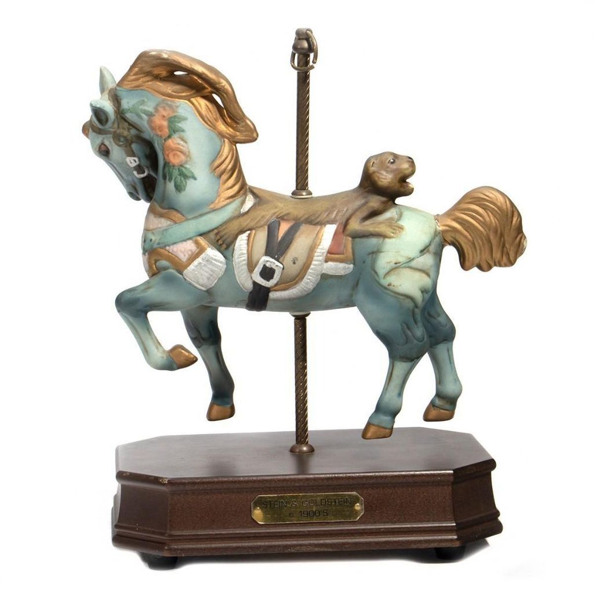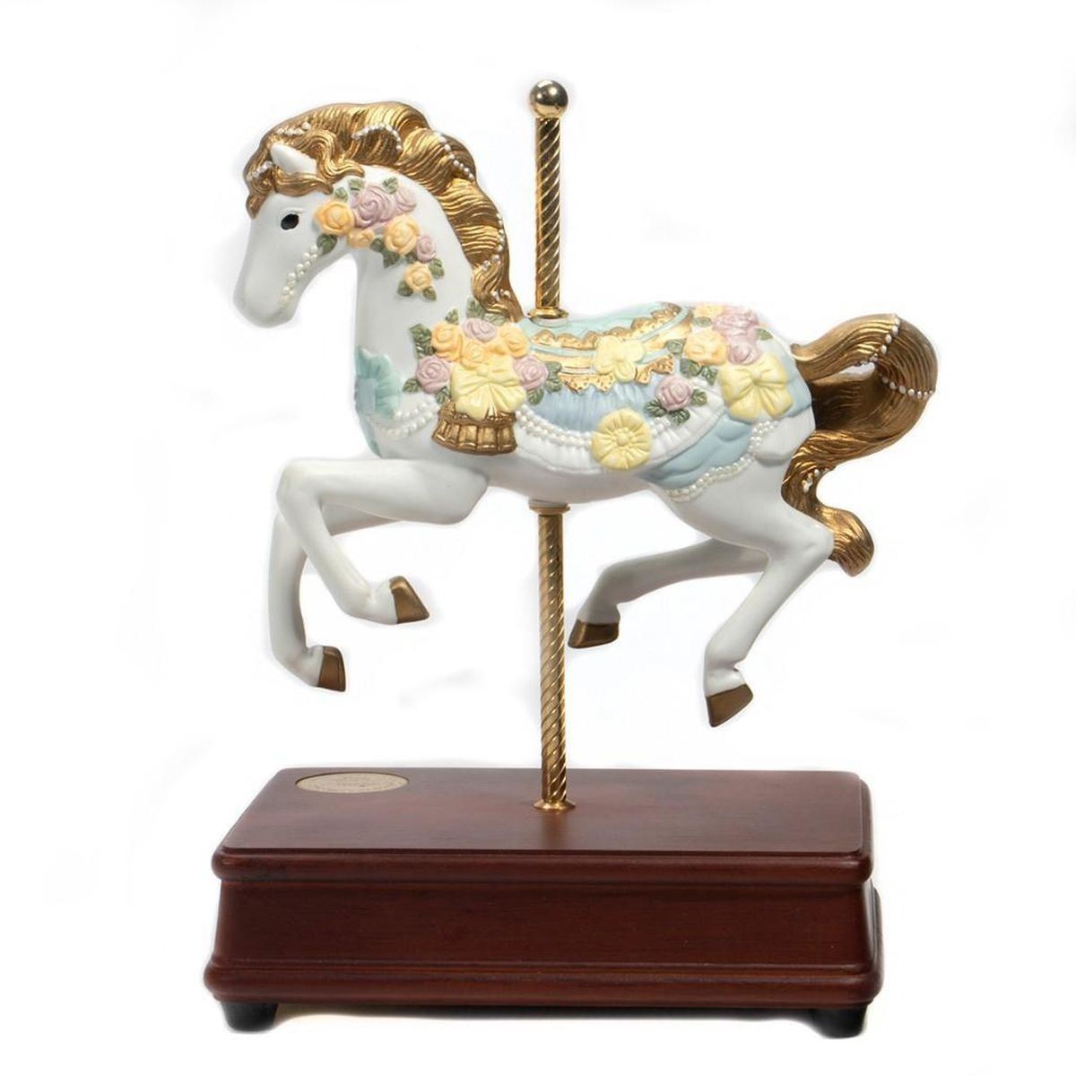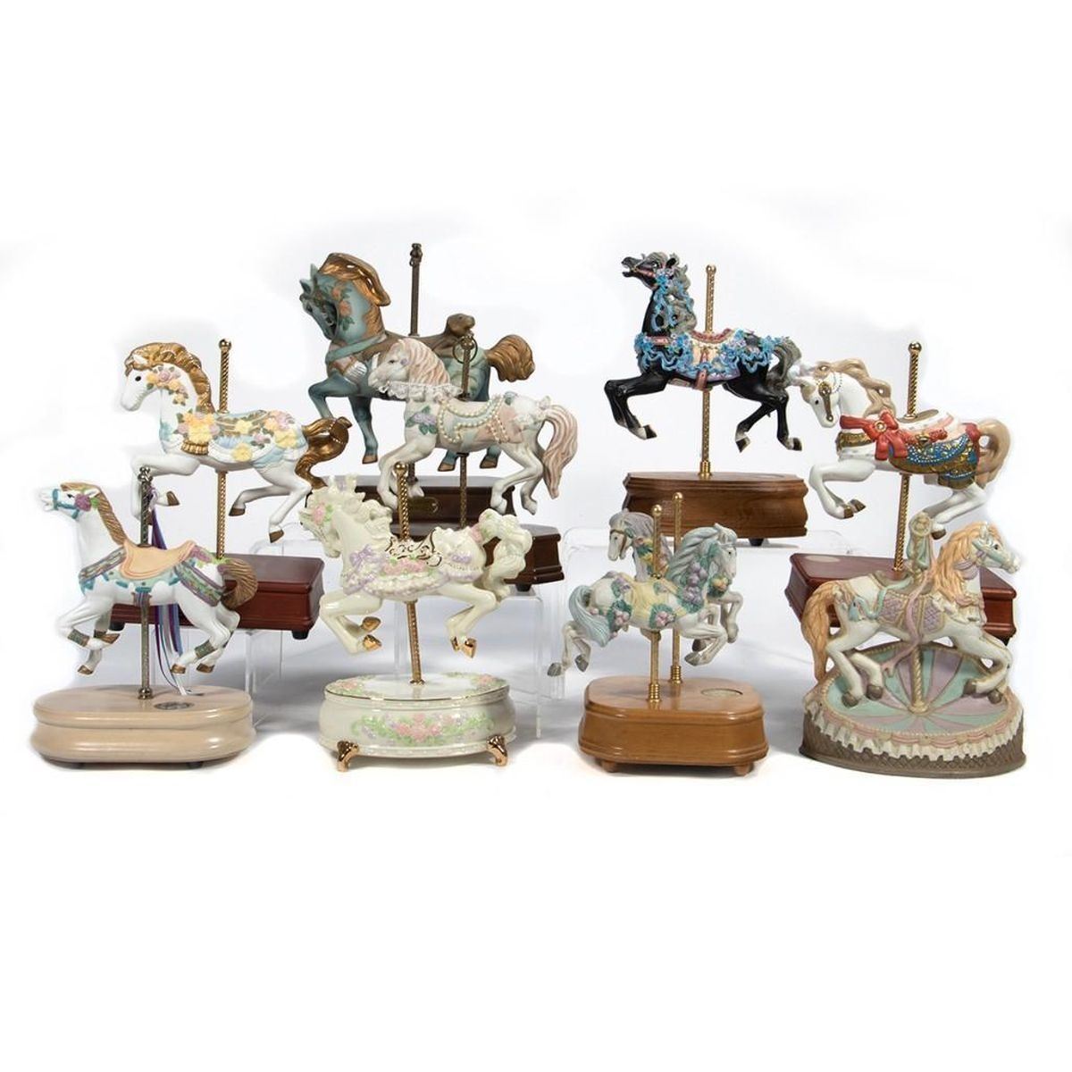 A collection of decorative ceramic carousel horses on music box bases. Greatest height 9in. Condition: Very good, music box works not guaranteed.