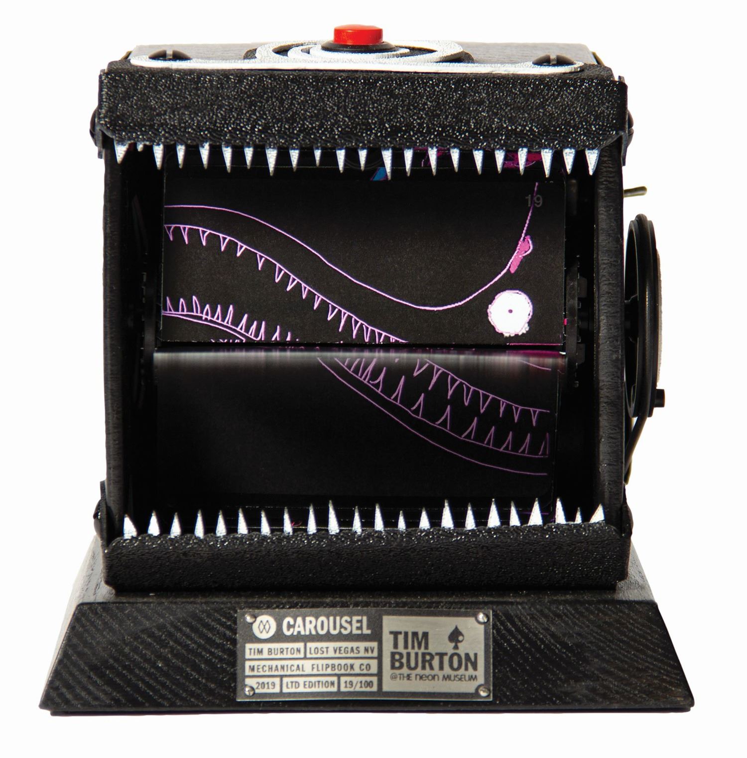 (Tim Burton, 2019) An incredible limited edition motorized mechanical flipbook designed by Tim Burton exclusively for his 2019 "Lost Vegas" art exhibition at the Neon Museum in Las Vegas. Titled "Carousel", the flipbook device contains printed blacklight art created by Burton that illuminates and moves on a belt-driven spindle when activated. The flipbook was made in an edition size of only 100 pieces and this is number 19 of that edition. The entire piece measures 6.5"x 6.5"x6.5". In very fine condition, the flipbook includes its original box and certificate of authenticity.