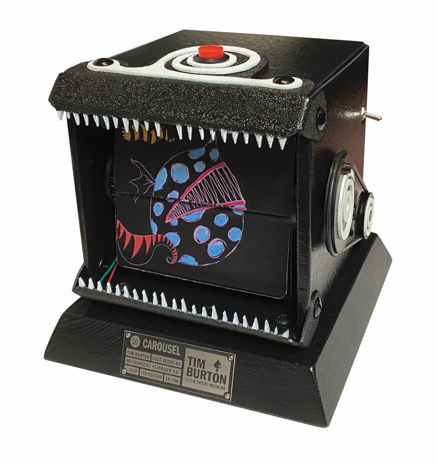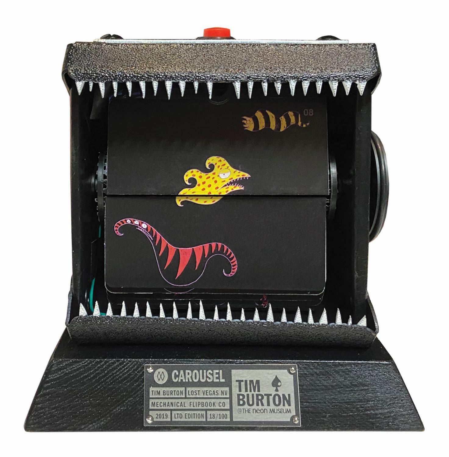 (Tim Burton, 2019) An incredible limited edition motorized mechanical flipbook designed by Tim Burton exclusively for his 2019 "Lost Vegas" art exhibition at the Neon Museum in Las Vegas. Titled "Carousel," the flipbook device contains printed blacklight art created by Burton that illuminates and moves on a belt-driven spindle when activated. The flipbooks were created in an edition of only 100, and this piece is number 18. The original box and COA are included. Measuring 6.5"x 6.5"x6.5", the flipbook is in very fine condition.