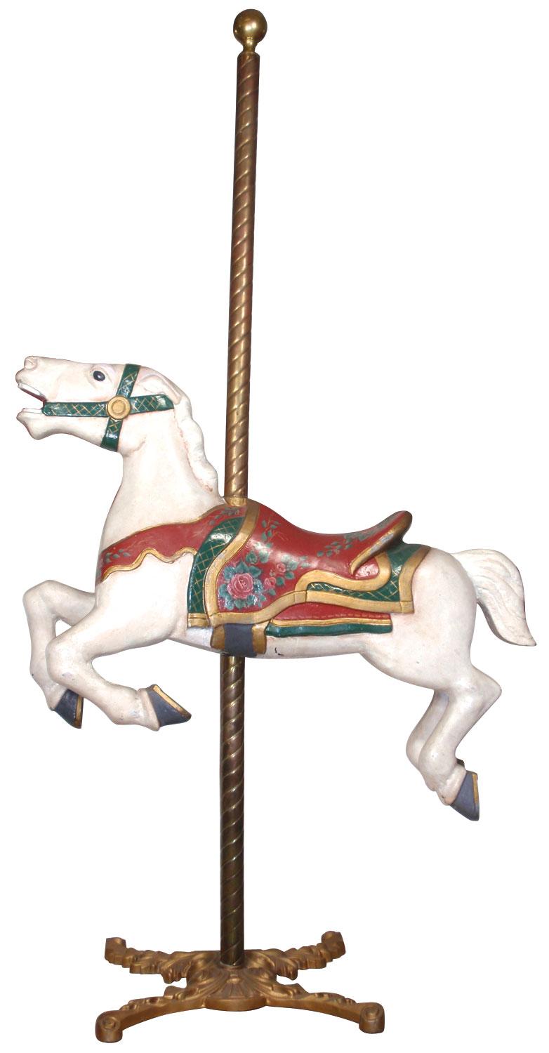 Carousel horse, Herschell Spillman painted cast aluminum jumper from the Balboa Fun Zone at Newport Beach, one of the last horses made at the Herschell Spillman factory, c.1950's, fully restored in off-white powder coat w/detailed oil finish, mounted on a 2" spiral brass pole & deluxe cast base, Exc cond, 66"H x 44"L x 9"W.