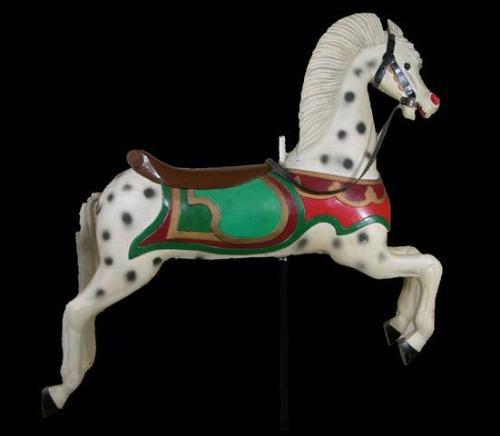 Carousel horse carved by Mr. Parker w/original paint, glass eyes, 1920s finish, 45 inches length. Good Cond.