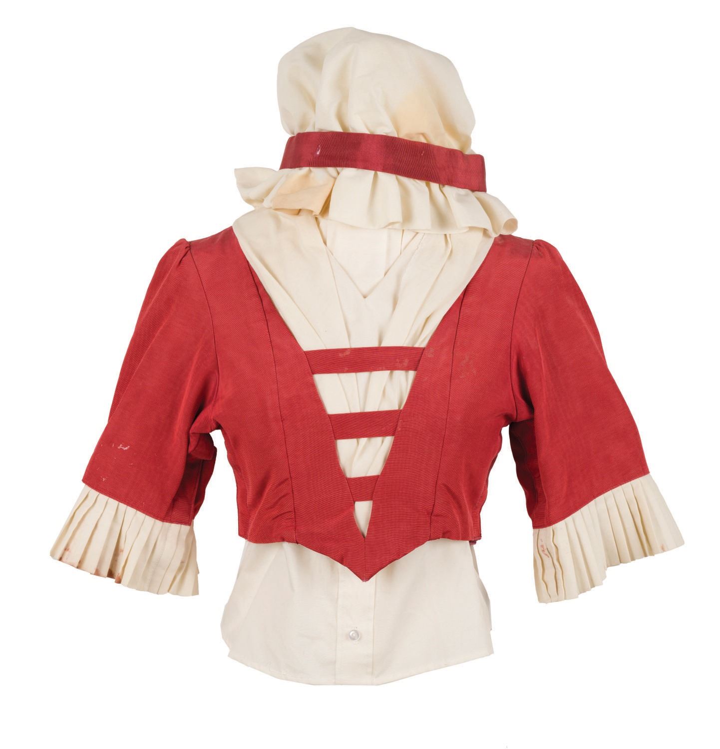 (Walt Disney World, c.1975-2022) Two shirts and a mob cap prepared for the Sarah, the "Mother" Audio-Animatronics figure within the Carousel of Progress at The Magic Kingdom. During the "Roarin' Twenties" (Act II) Sarah's Lady's Club is responsible for the Fourth of July celebration, and she is found preparing a George Washington costume while wearing a Martha Washington costume. This mob cap, and pair of shirts feature velcro, were specifically prepared for Audio-Animatronics Figure 14 of the Carousel of Progress, and were removed during a previous rehabilitation. The property control tags in both shirts retain hand annotation like "Act II, Mother" and the amendment Figure "24." Each piece feature various measurements for specific figures and display in good overall condition, despite some wear to threads and minor stains from Park use.