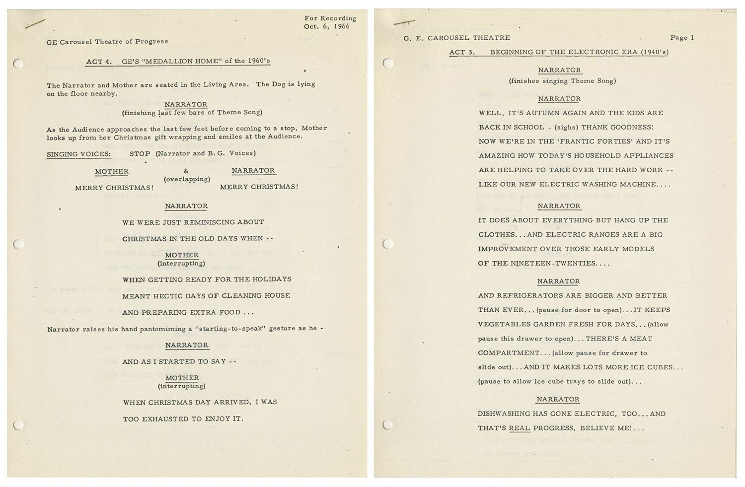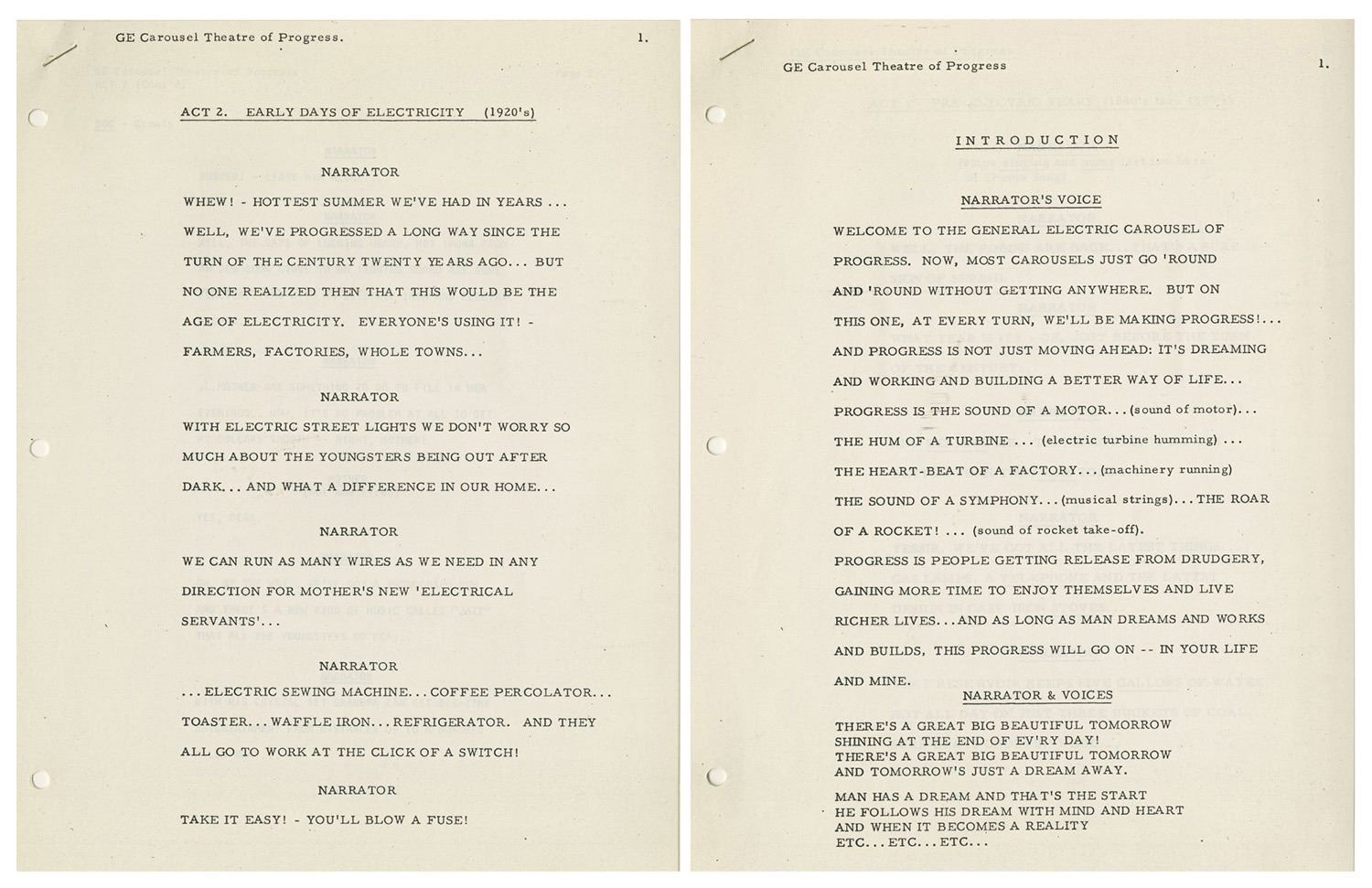 (Disneyland, 1966-67) A very rare script for the Carousel of Progress at Disneyland. The script describes the attraction narration, and takes guests on a tour of technology from the pre-electric era to the 1960s. This incredible script provides a fascinating glimpse into the development of the attraction following its time at the 1964-65 New York World's Fair. The 25-page script measures 11.5"x9.25" within its blue outer WED Enterprises folder, and is in very good condition with minor yellowing around the edges of the cover.