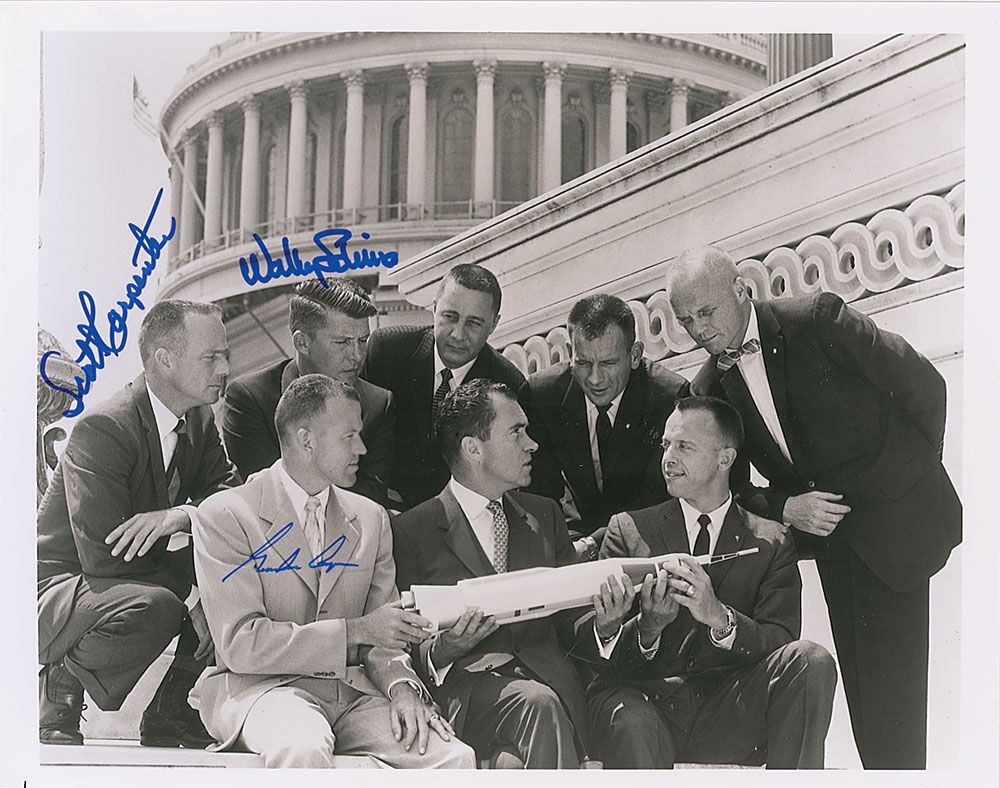 Glossy 10 x 8 photo of the Mercury astronauts showing a model rocket to President Nixon, signed in blue felt tip by Scott Carpenter, Wally Schirra, and Gordon Cooper. In very fine condition.
