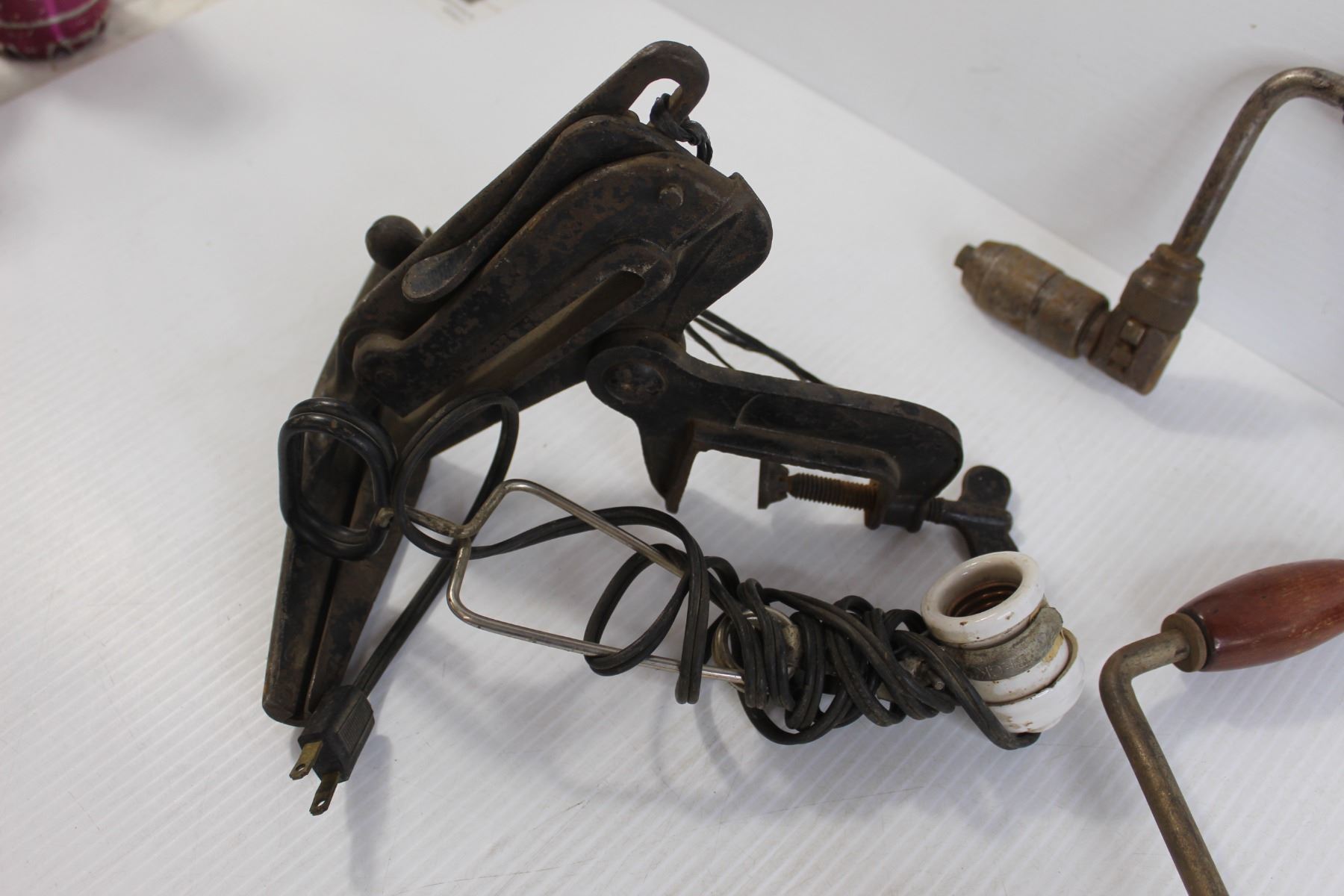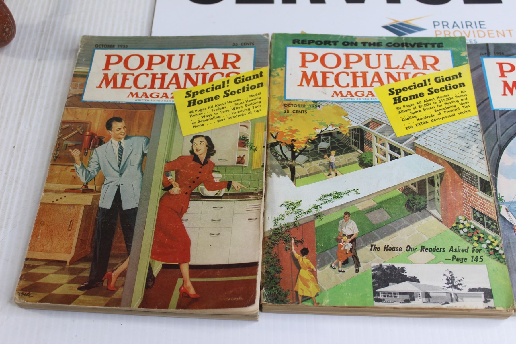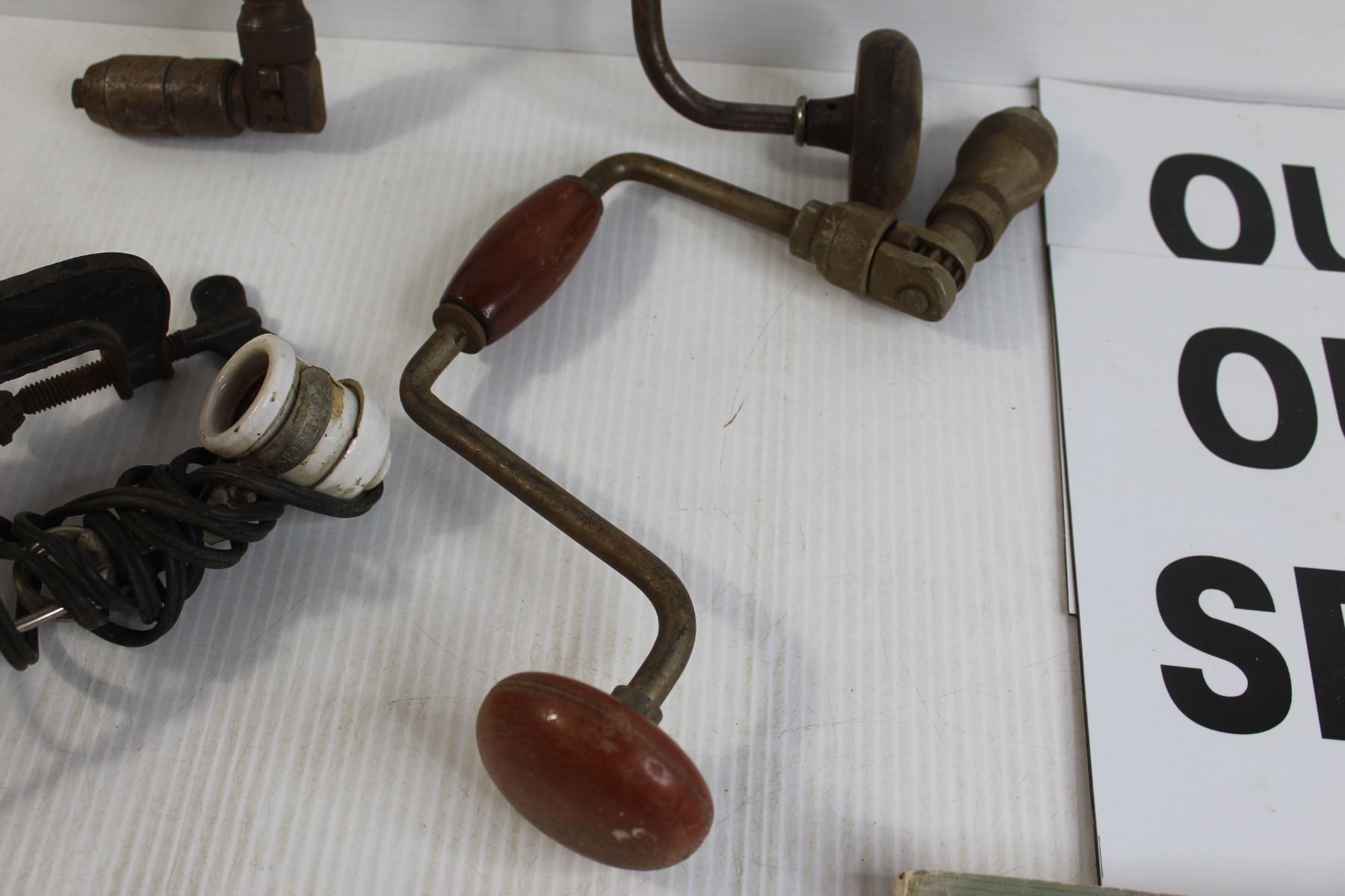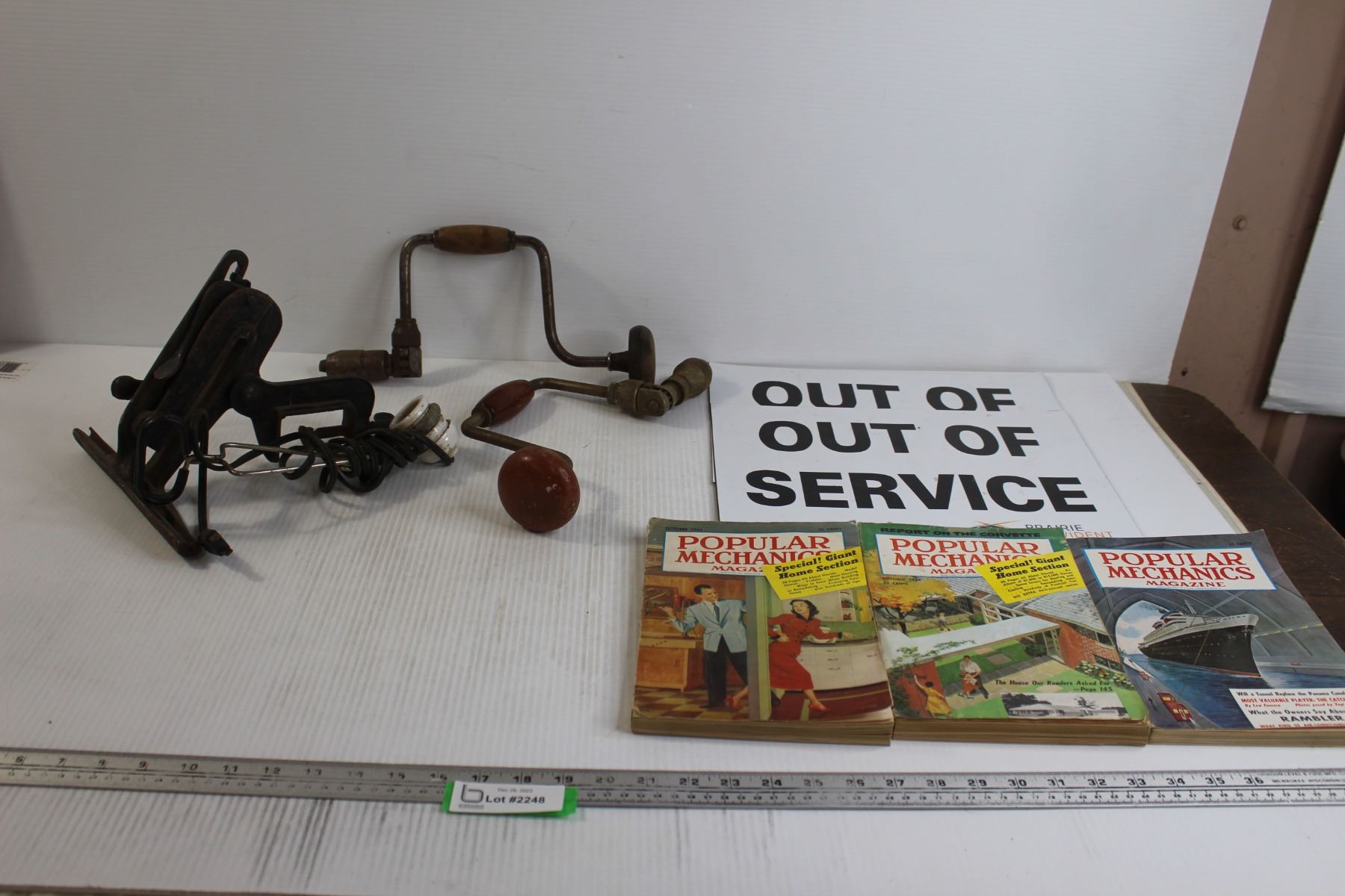 Carpenter's Brace, Saw Vise, (2) Out of Service Signs, (3) Popular Mechanics Magazines
