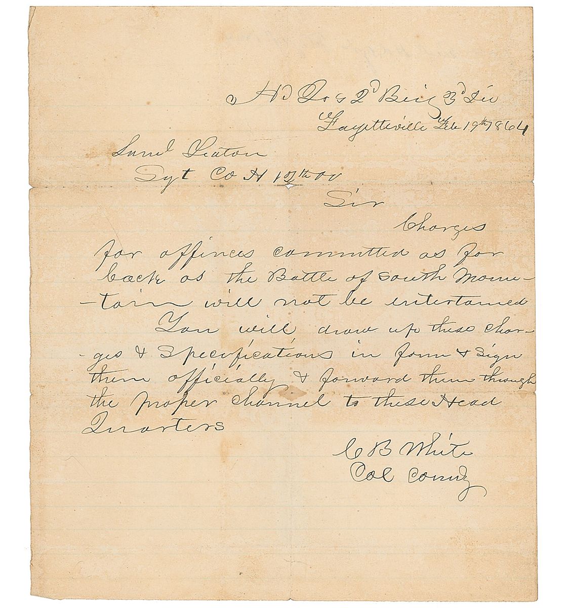 Union general (1823–1871) best known for his operations in West Virginia and Maryland. ALS signed “C. B. White, Col. Comdg.,” one page, 7.75 x 9.25, February 19, 1864. Letter to Samuel Leaton. In full: “Charges for offinces [sic] committed as far back as the Battle of South Mountain will not be entertained. You will draw up these charges & specifications in form & sign them officially & forward them through the proper channel to these Head Quarters.” In very good condition, with intersecting folds with a couple trivial separations, and scattered creases, toning, and soiling.