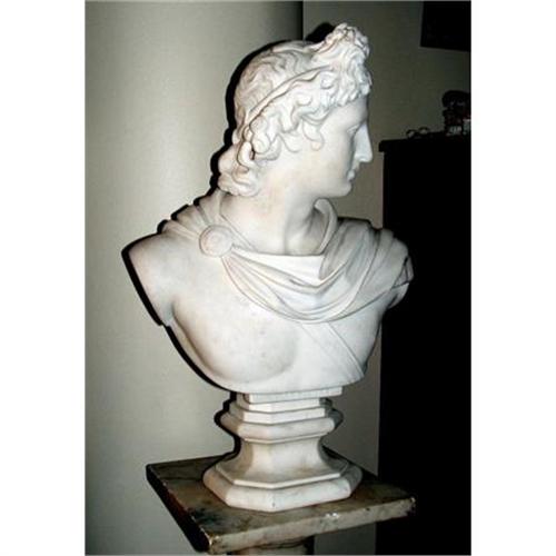 A Well carved APOLLO ( Belvedere) MARBLE BUST 19th c. White Carrara marble, In a Classic Greek style, the God Apollo is shown with his head turned sharply to the left, wearing a tunic with a brooch. Voluminous locks of hair are intricately carved; there is a uniform polish to the entire sculpture. Size:26" h., 21" w. Condition: Very good . WEIGHT IS about 200 POUNDS (estimate) . This is not just another Apollo bust, is very hard to find such an outstanding carving quality and condition.