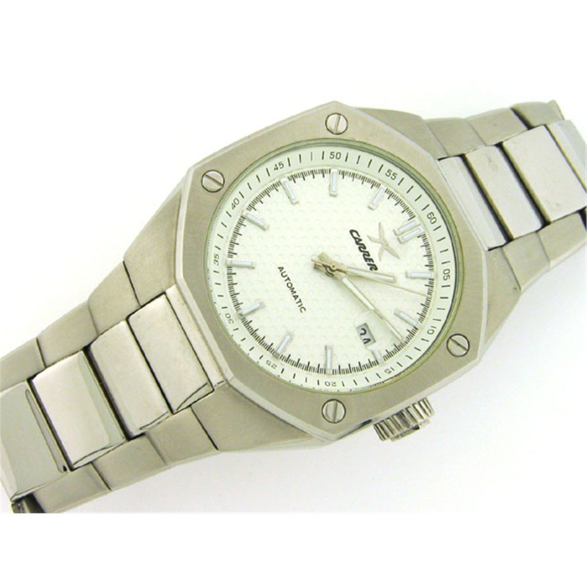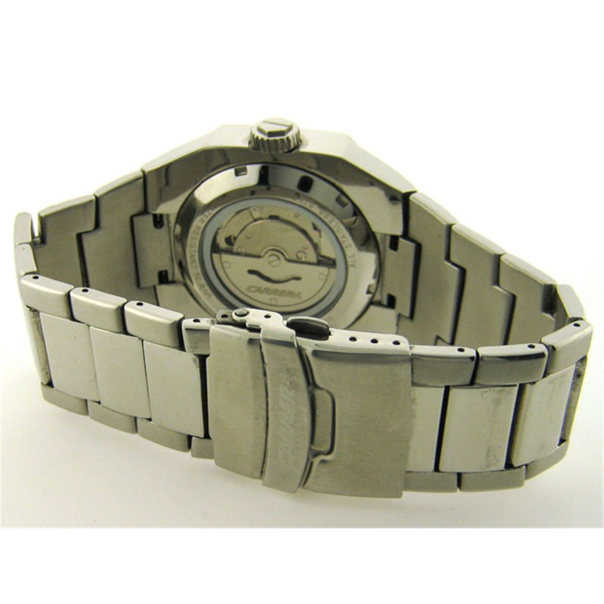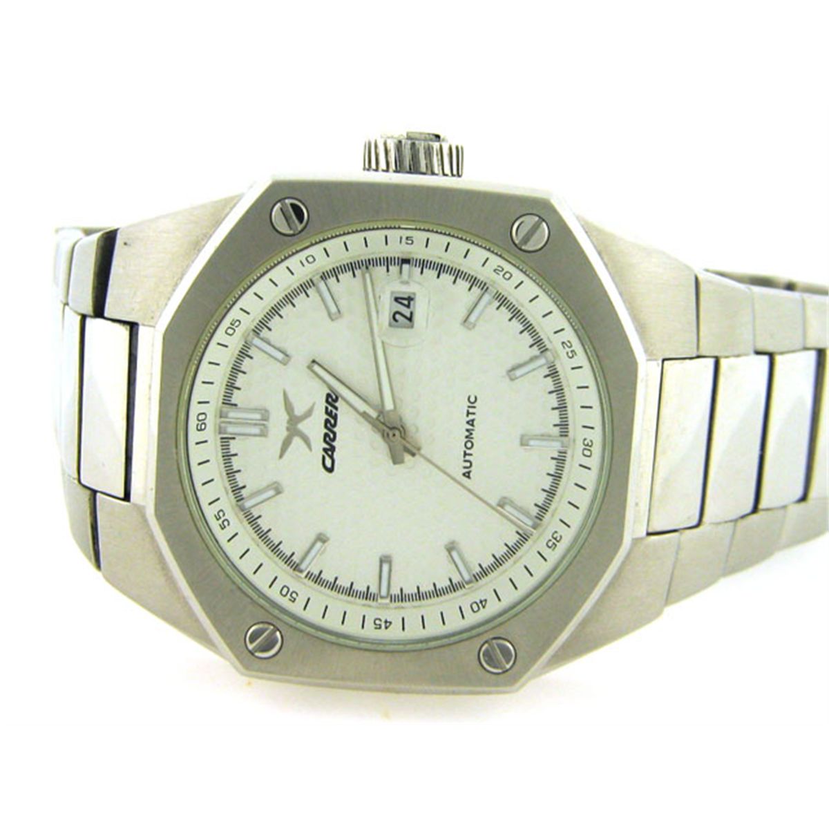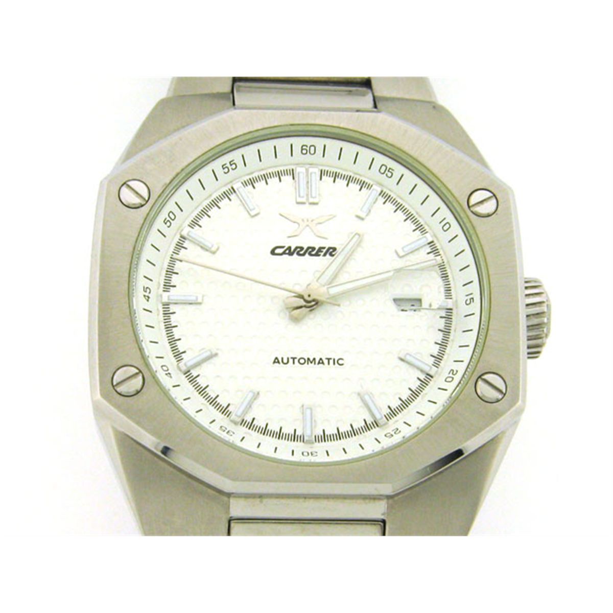 This is a Carrera Men's CW66491.403021 Sprint Automatic Stainless Steel Watch with the following features: automatic movement, 46-millimeter case, polished stainless steel case, bezel is with four screws, luminescent hands and numberless indexes, scratch-resistant sapphire crystal, white dial, tachymeter, date calendar is positioned at three o'clock, 27-millimeter silver bracelet with a safety clasp, water resistant to 330 feet