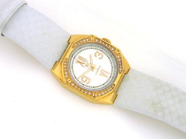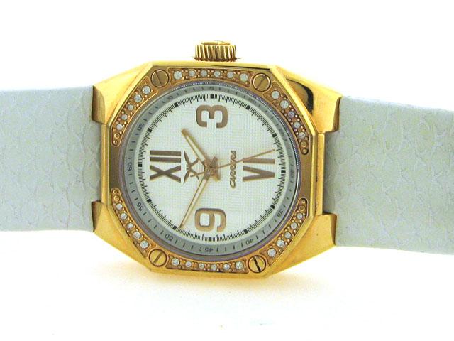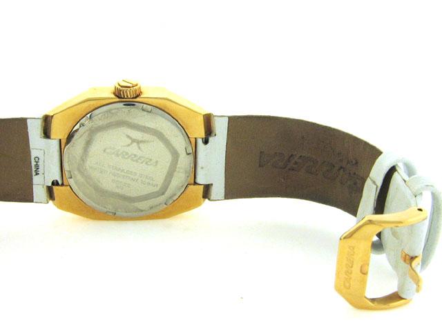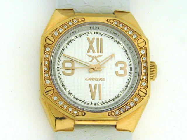 This is a Carrera Women's CW66522.115091 Sprint Crystal Leather Watch with the following features: stainless steel, 32-millimeter case, rose gold tone bezel, and crown, crystals on the bezel, white leather band with a Carrera logo pattern, tachymeter bezel, round white dial, alternating Roman- and Arabic-numeral hour markers, and Water-resistant to 330 feet (100 M).