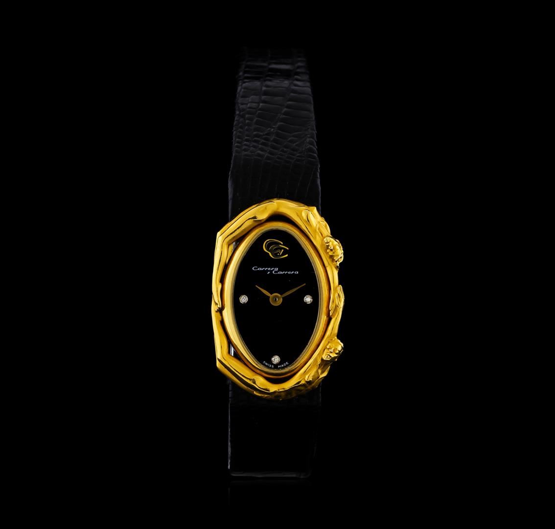 One, Carrera y Carrera wristwatch electronically tested 18KT yellow gold, Case: 28 x 18mm, Case back: engraved with the manufacturers logo, and ID numbers. Two curved figures; a naked male and a naked female reaching out to each other, interconnected by their hands & feet. Sensual, romantic, and elegance, captured by the Carrera y Carrera artisans. Movement: quartz, Carrera y Carrera signed Dial: Black color, baton pointed hands & three diamond markers, Carrera y Carrera Swiss Bracelet: Black color leather strap, Condition: G-5 Fine. Seven inch length. Carrera y Carrera signed gold filled buckle. Total Weight of Watch18.61gm. AIG Appraised at $5,050.00.