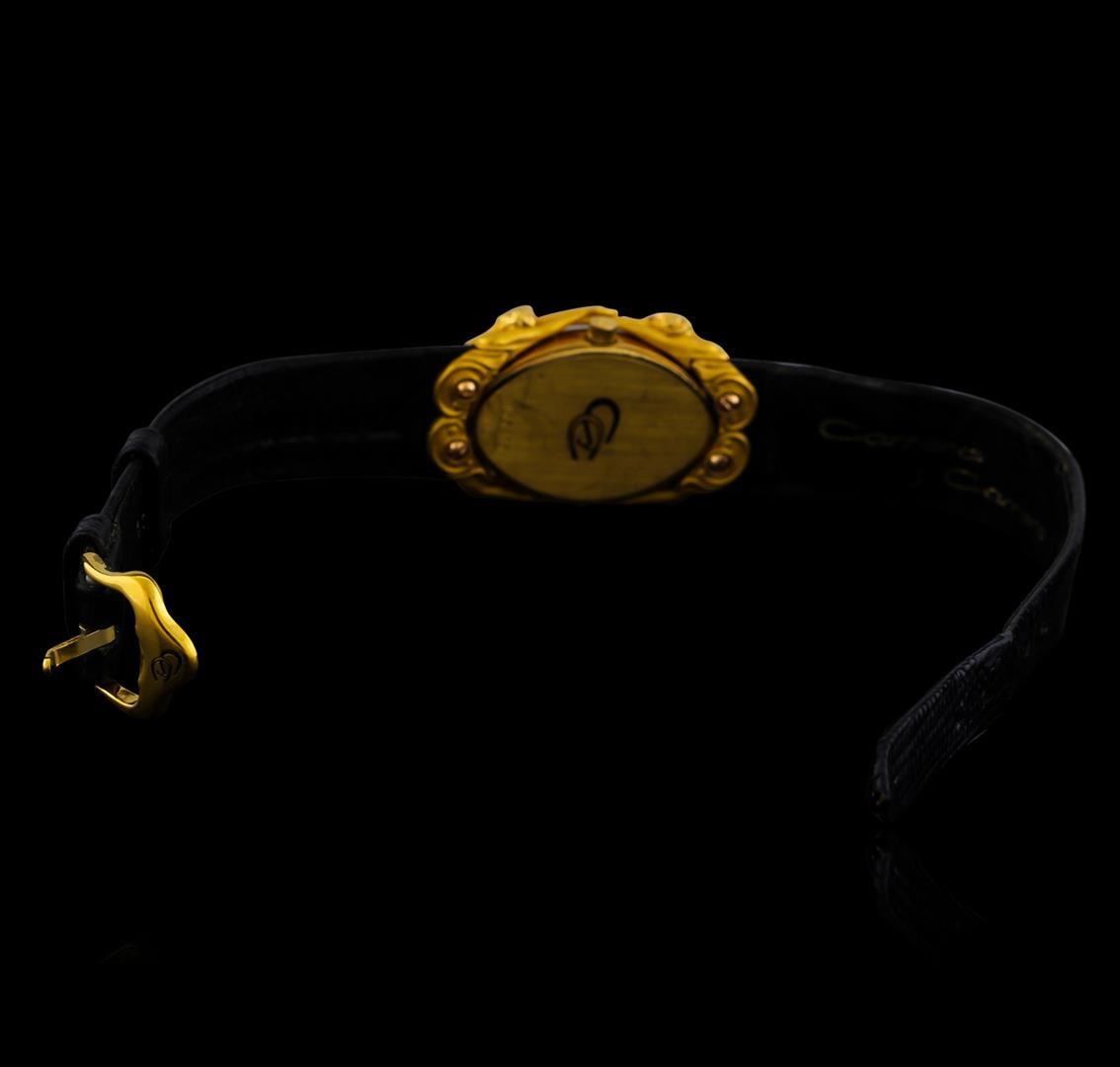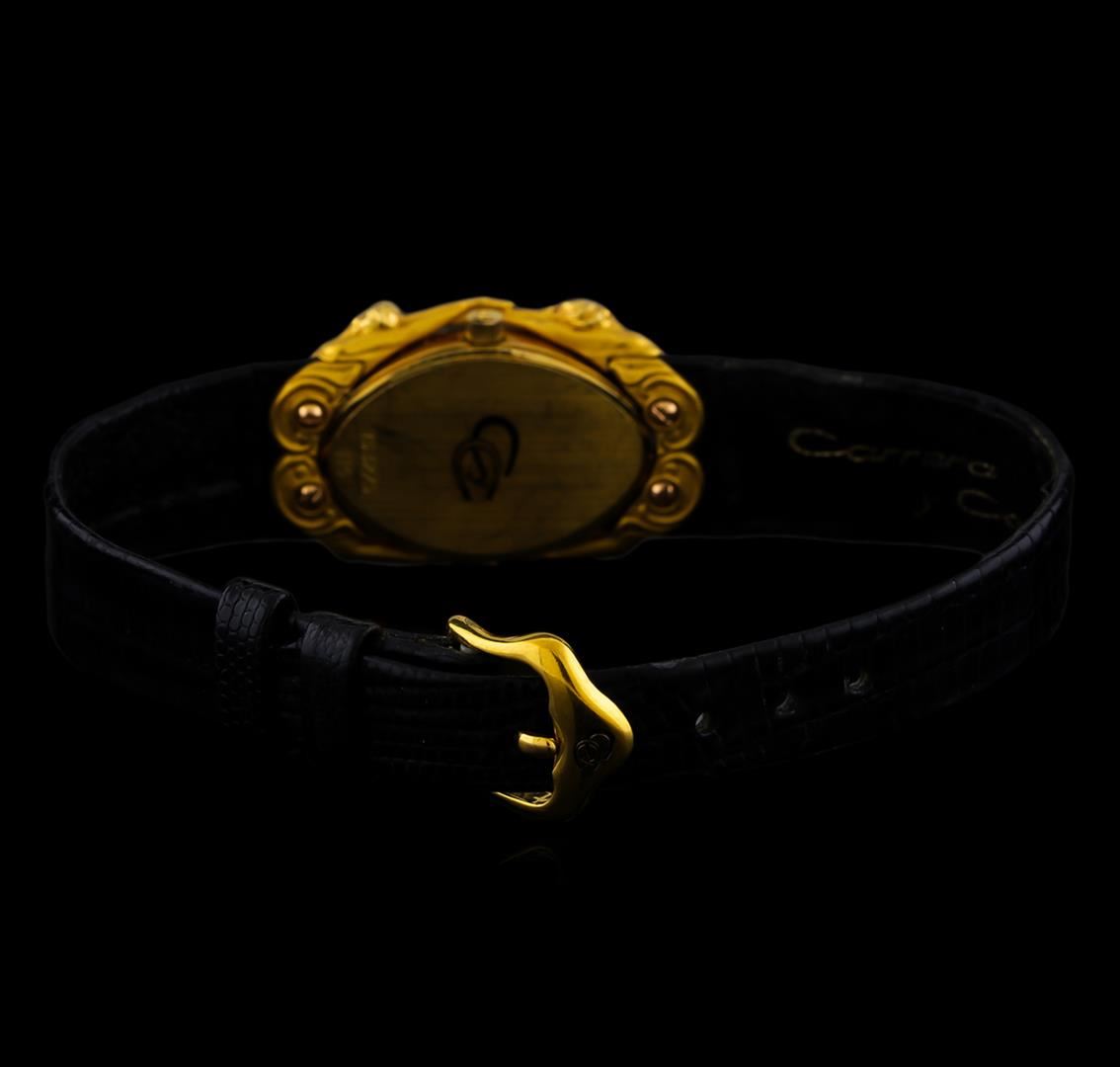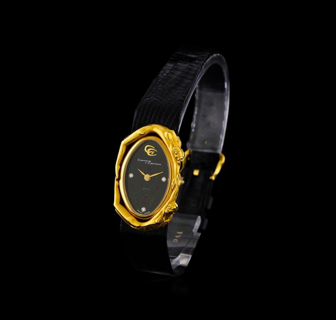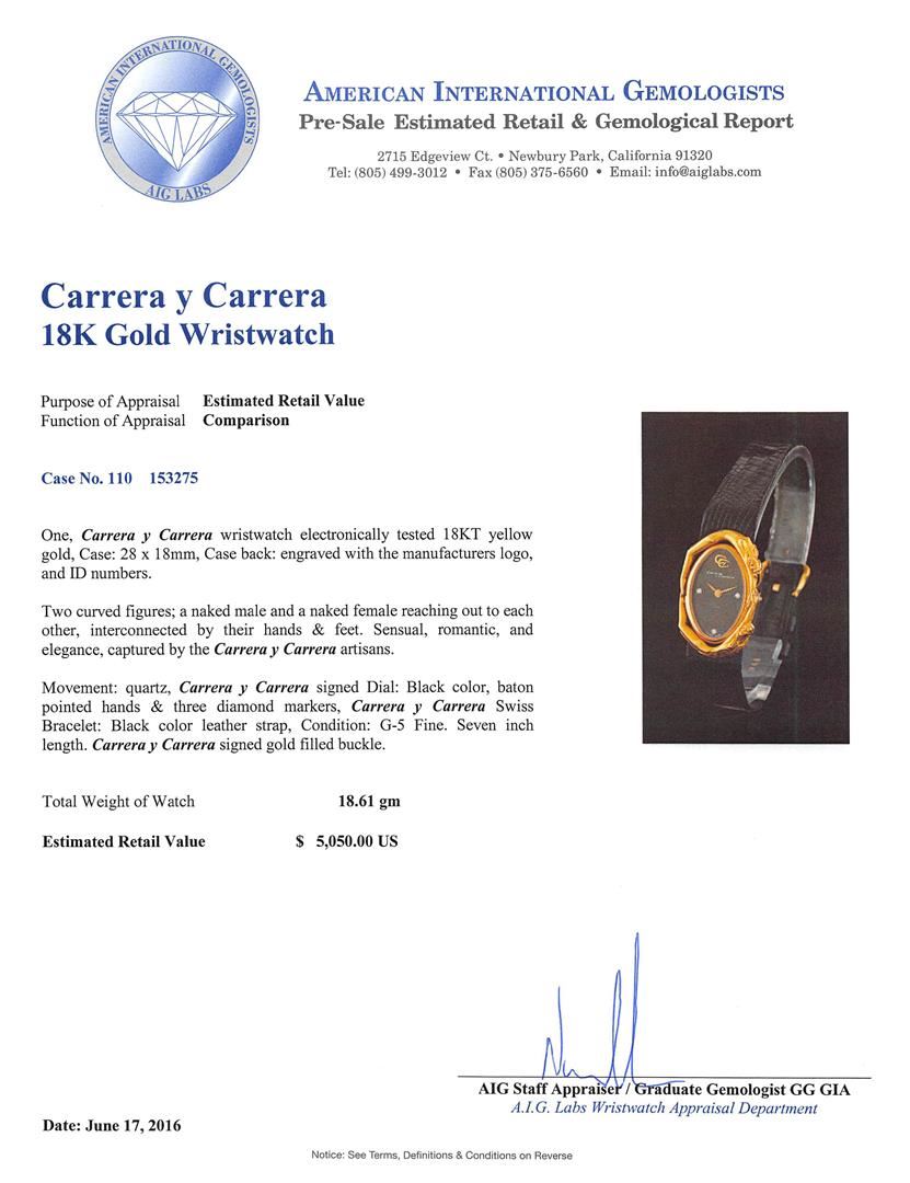 One, Carrera y Carrera wristwatch electronically tested 18KT yellow gold, Case: 28 x 18mm, Case back: engraved with the manufacturers logo, and ID numbers. Two curved figures; a naked male and a naked female reaching out to each other, interconnected by their hands & feet. Sensual, romantic, and elegance, captured by the Carrera y Carrera artisans. Movement: quartz, Carrera y Carrera signed Dial: Black color, baton pointed hands & three diamond markers, Carrera y Carrera Swiss Bracelet: Black color leather strap, Condition: G-5 Fine. Seven inch length. Carrera y Carrera signed gold filled buckle. Total Weight of Watch18.61gm. AIG Appraised at $5,050.00.