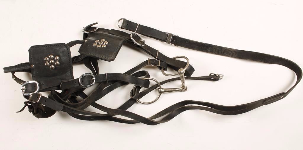 Smooth black leather with spotted design for one horse Chest piece, bridle, blinders and more.