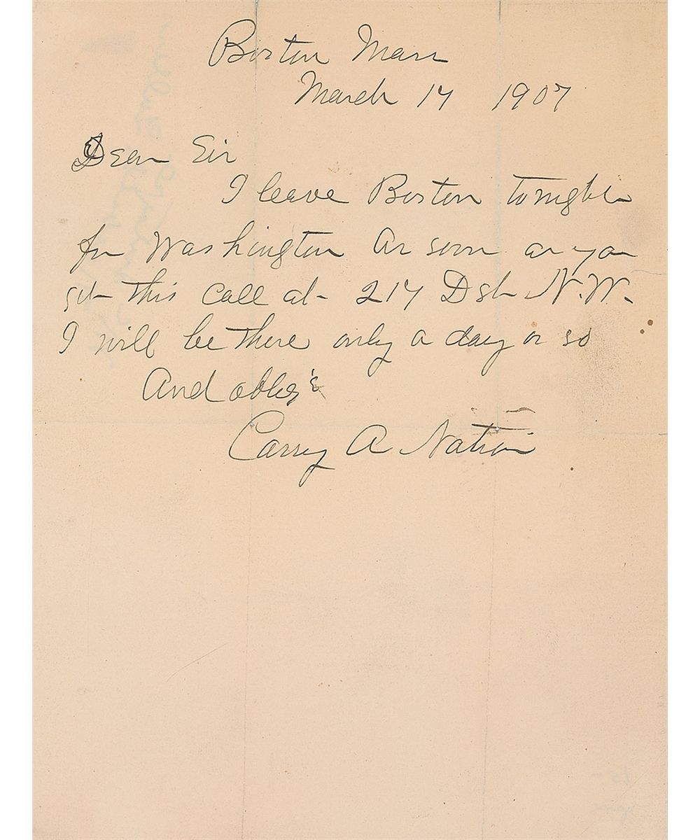 Temperance agitator (1846–1911) known for smashing saloons with a hatchet. ALS signed “Carrie A. Nation,” one page, 6.5 x 8.5, March 17, 1907. Letter to a gentleman reads, in full: “I leave Boston tonight for Washington. As soon as you get this call at 217 D St NW. I will be there only a day or so.” Intersecting folds, a couple passing through signature, as well as a few small fold separations, otherwise fine condition.