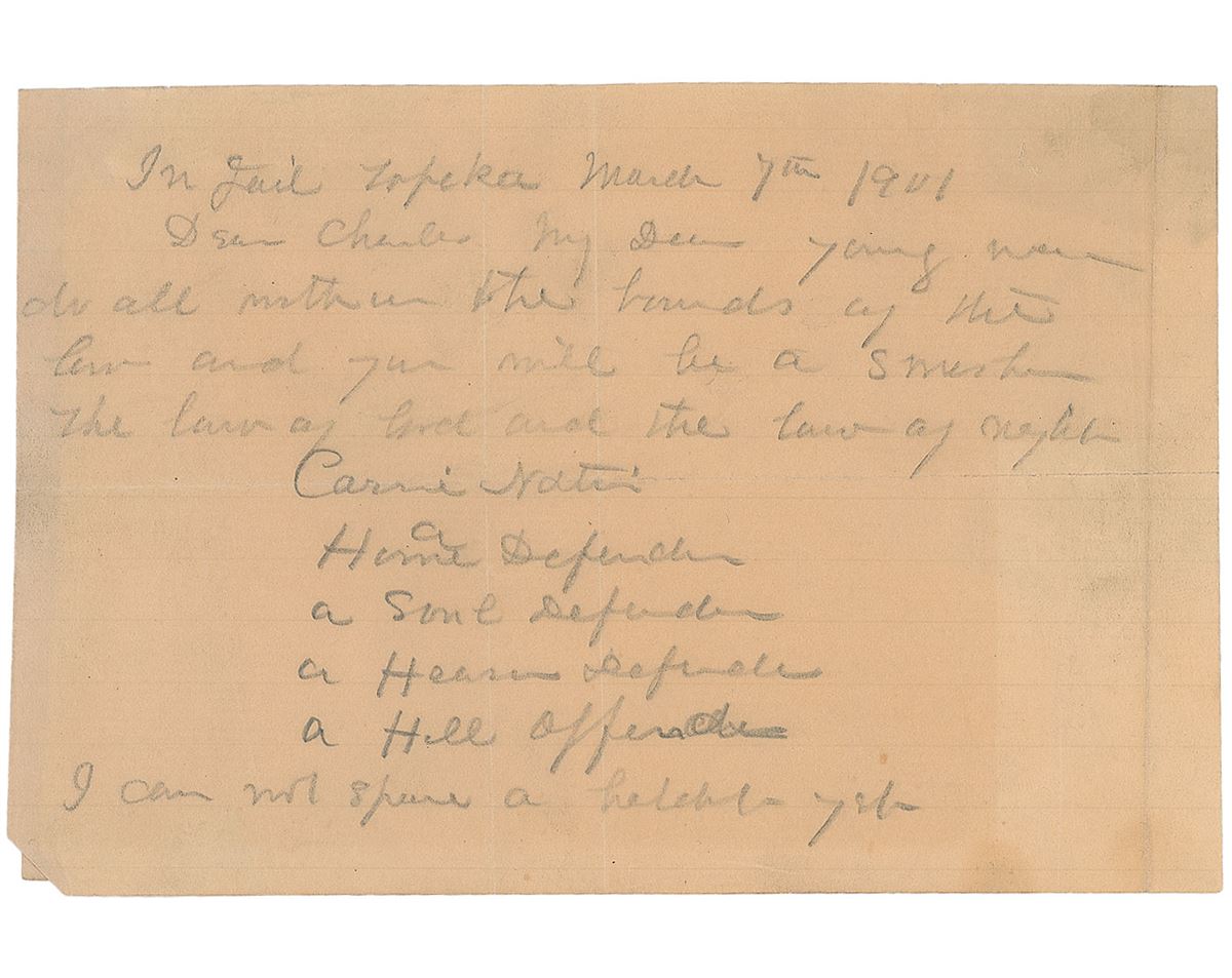 Temperance agitator (1846–1911) known for smashing saloons with a hatchet. ALS in pencil, signed “Carrie Nation,” one page, 7.5 x 5, March 7, 1901. Letter to an admirer, headed “In Jail, Topeka.” In full: “My dear young man, do all within the bounds of the law and you will be a smasher. The law of God and the law of right.” Beneath her signature, Nation adds: “A Home Defender, A Soul Defender, A Heaven Defender, A Hell Offender, I can not spare a hatchet yet.” Intersecting folds passing through the signature, light creases and toning, and show-through from mounting remnants to reverse, otherwise fine condition. Ideal content from the outlaw teetotaler, who was arrested more than thirty times during her violent temperance campaigns.