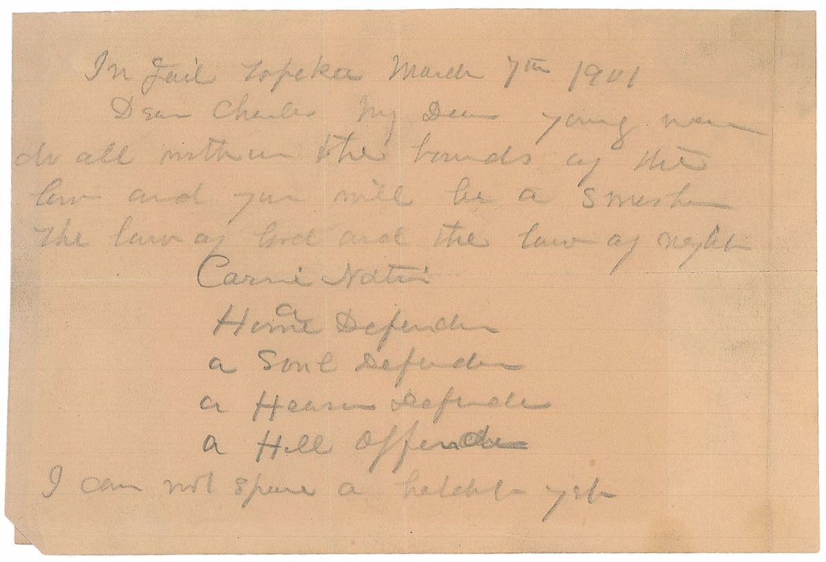 Temperance agitator (1846–1911) known for smashing saloons with a hatchet. ALS in pencil, signed “Carrie Nation,” one page, 7.5 x 5, March 7, 1901. Letter to an admirer, headed “In Jail, Topeka.” In full: “My dear young man, do all within the bounds of the law and you will be a smasher. The law of God and the law of right.” Beneath her signature, Nation adds: “A Home Defender, A Soul Defender, A Heaven Defender, A Hell Offender, I can not spare a hatchet yet.” Intersecting folds passing through the signature, light creases and toning, and show-through from mounting remnants to reverse, otherwise fine condition. Ideal content from the outlaw teetotaler, who was arrested more than thirty times during her violent temperance campaigns.
