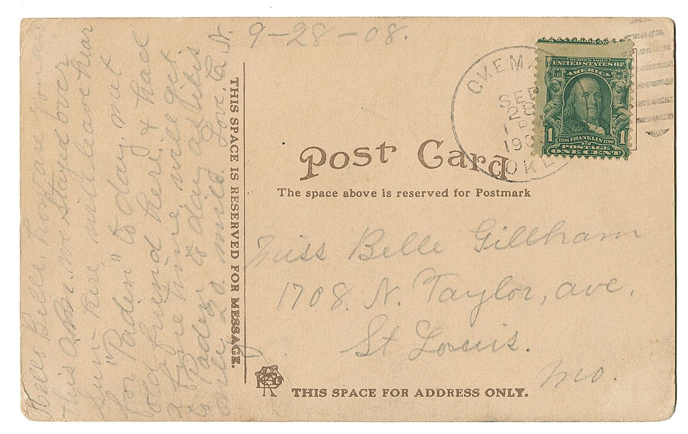 Temperance agitator (1846–1911) known for smashing saloons with a hatchet. ALS in pencil, signed “C. N.,” one page on the reverse of a color 5.5 x 3.5 postcard of the Public School in Okemah, Oklahoma, September 28, 1908. Letter to Belle Gillham, in full (spelling and grammar retained): "How are you all this a.m. we Stayed over Sun—here, will leave hear for 'Paden' today, met old friend here & had a fine time, will get to Paden to day as it is only 20. mile." In fine condition.