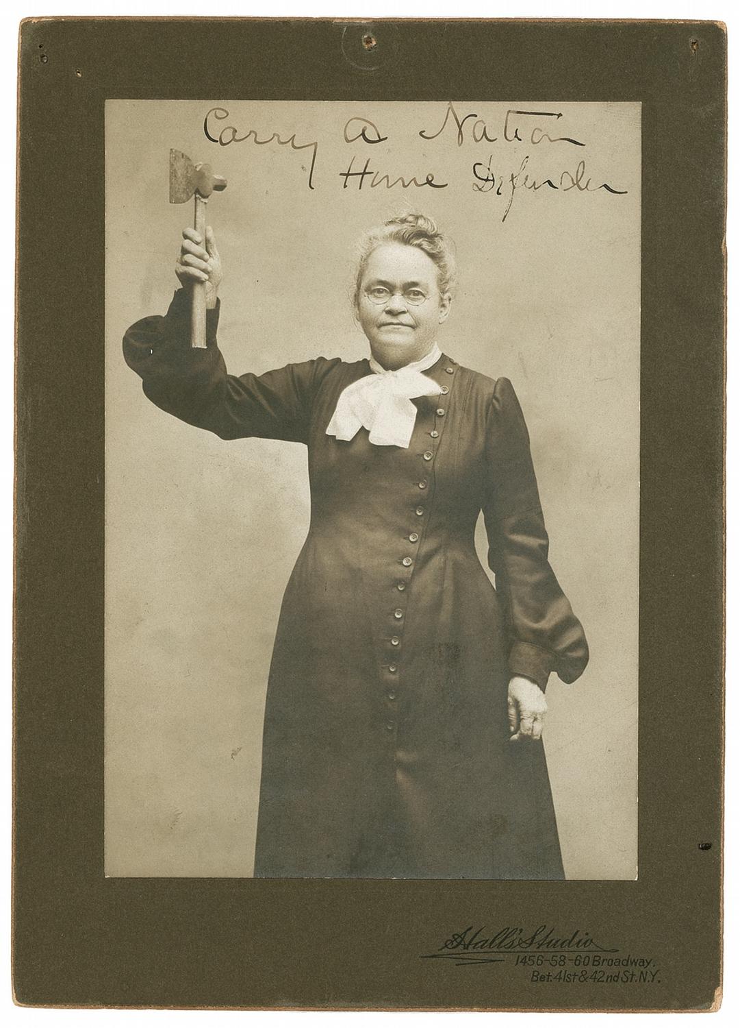 Temperance agitator, she was known for smashing saloons with a hatchet. Exceptional 5 x 7.25 cabinet portrait by Hall’s Studio, New York, of Nation wearing a sober, non-nonsense look and wielding her trademark hatchet, signed in ink above her head, “Carry A. Nation, Home Defender.” Three tack holes to top border, some trivial chipping to extreme edges of the mount, and faint silvering to the image, otherwise fine condition.