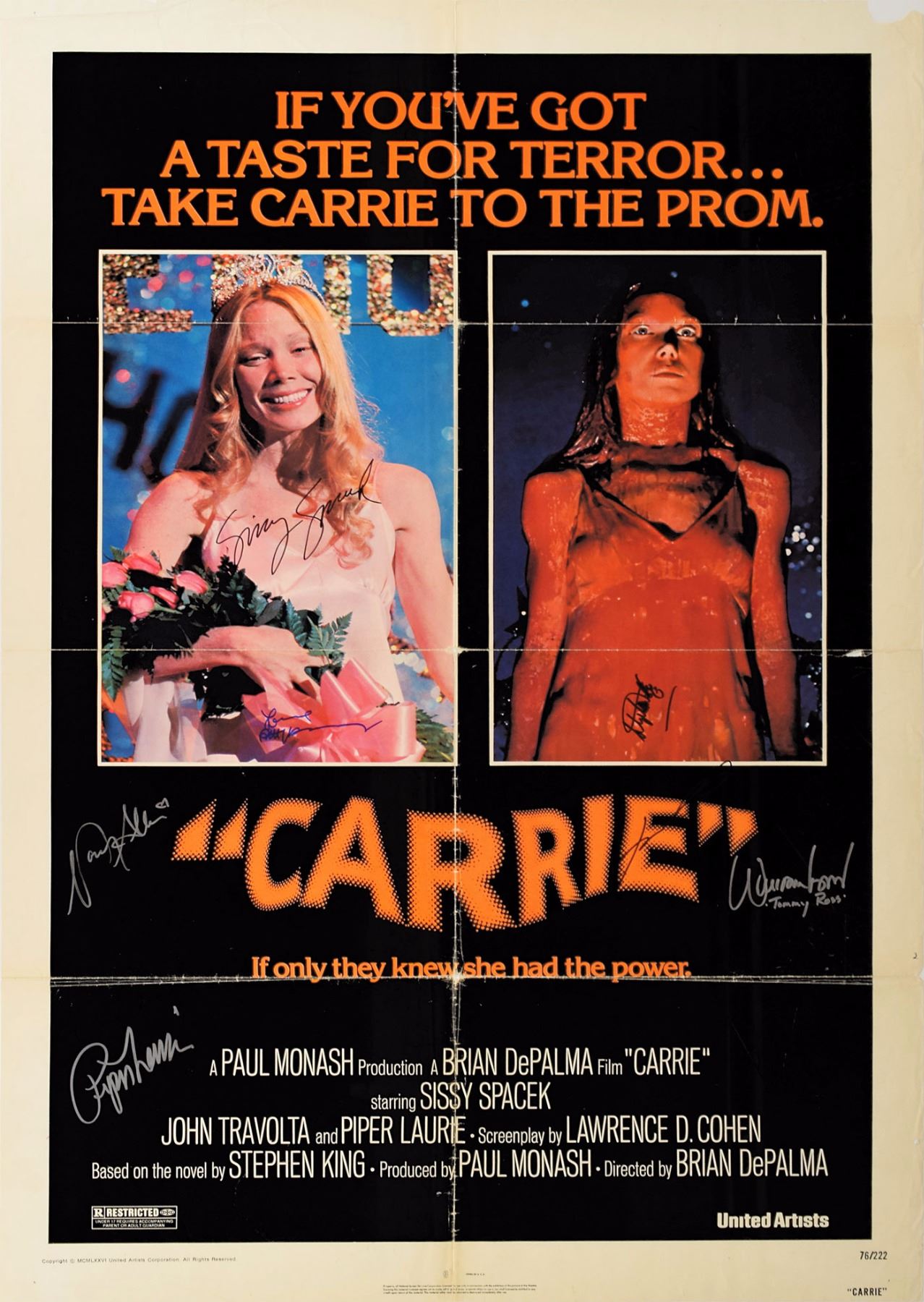 Original color 27 x 41 one-sheet movie poster for the 1976 horror film Carrie, signed in black felt tip by Stephen King, Sissy Spacek, and John Travolta, in blue felt tip by Betty Buckley, and in silver ink by Piper Laurie, Nancy Allen, and William Katt. In very good, folded condition, with overall creasing, separation at folds, paper loss to upper corners, and a lengthy tear to right side along fold.