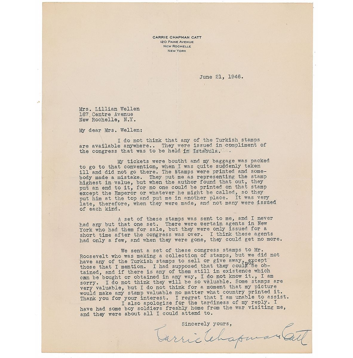 TLS, one page, 8.5 x 11, personal letterhead, June 21, 1946. Letter to a stamp collector. In part: “I do not think that any of the Turkish stamps are available anywhere…They put me as representing the stamp highest in value, but when the author found that out, they put an end to it, for no one could be printed on that stamp except the Emperor or whatever he might be called, so they put him at the top and me in another place…We sent a set of these congress stamps to Mr. Roosevelt who was making a collection.” In fine condition, with intersecting folds, one through a single letter of signature. Accompanied by the original mailing envelope.