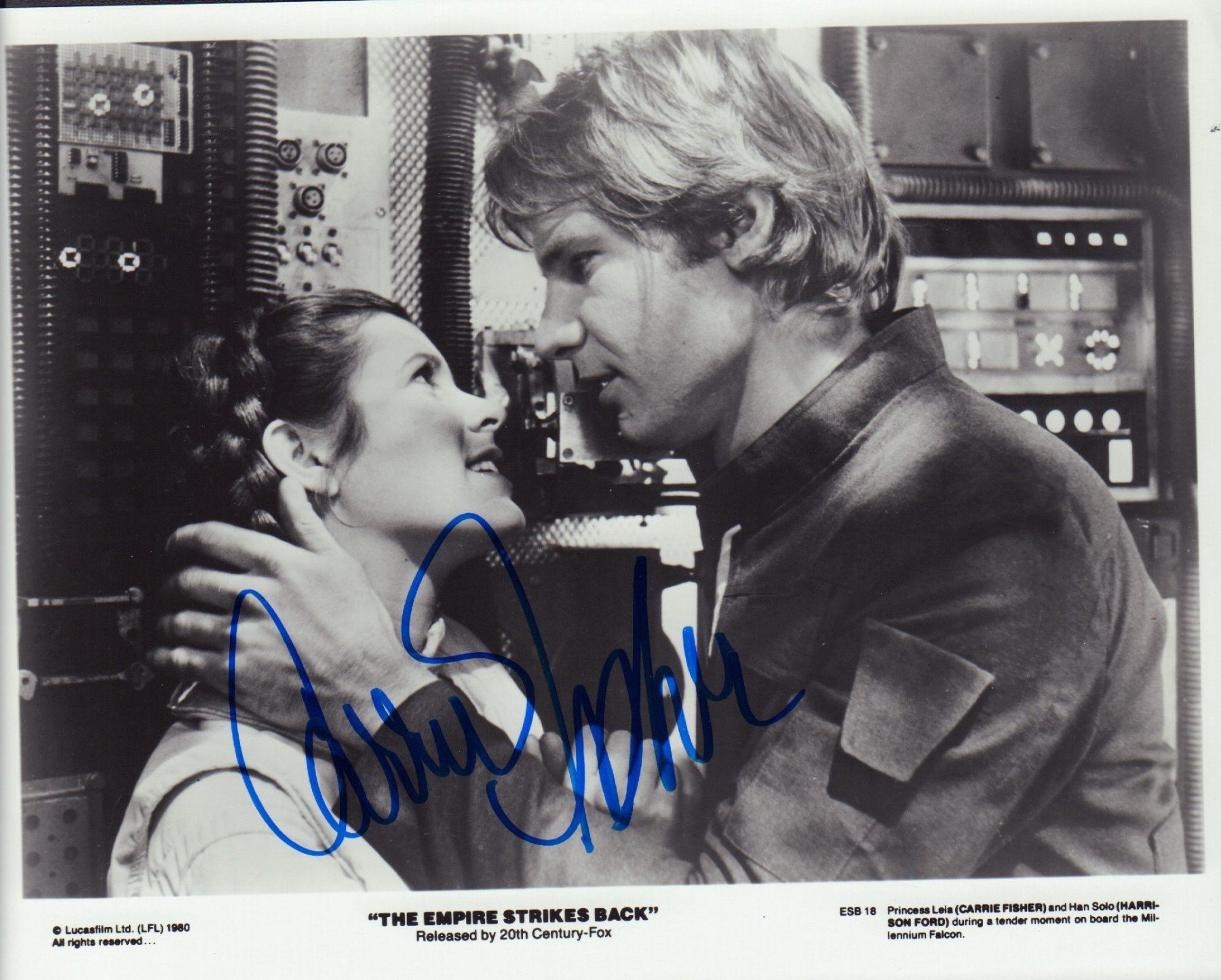 Black and white 8x10 original photograph from the film The Empire Strikes Back signed by Carrie Fisher. All items come with a certificate of authenticity good for the life of the piece.