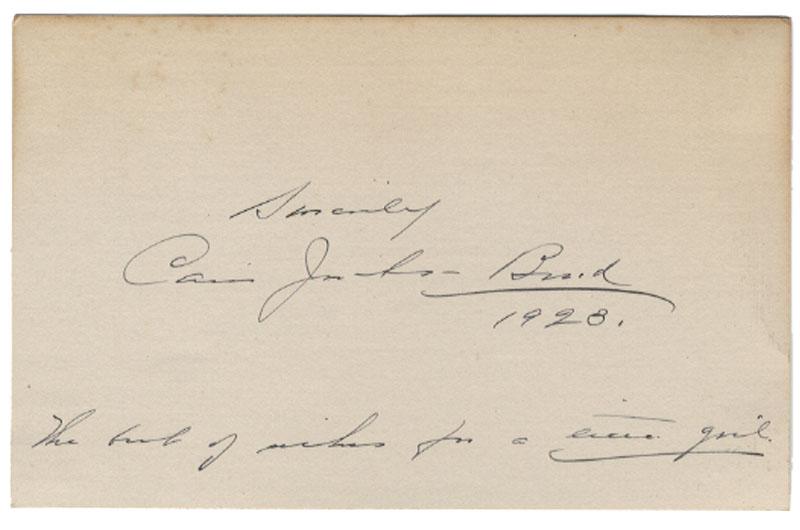 Carrie Minetta Jacobs-Bond (1862 – 1946). American singer, pianist, and songwriter. Signed Card. 5 1/8" x 3 1/4". "Sincerely, Carrie Jacobs-Bond, 1928. The best of wishes for a little girl." Excellent.