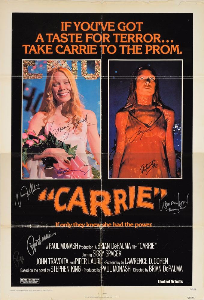 Original color 27 x 41 one-sheet movie poster for the 1976 horror film Carrie, signed in black felt tip by Stephen King, Sissy Spacek, and John Travolta, in blue felt tip by Betty Buckley, and in silver ink by Piper Laurie, Nancy Allen, and William Katt. In very good condition, with small areas of paper loss along intersecting folds, scattered light creasing, and wear to the edges.