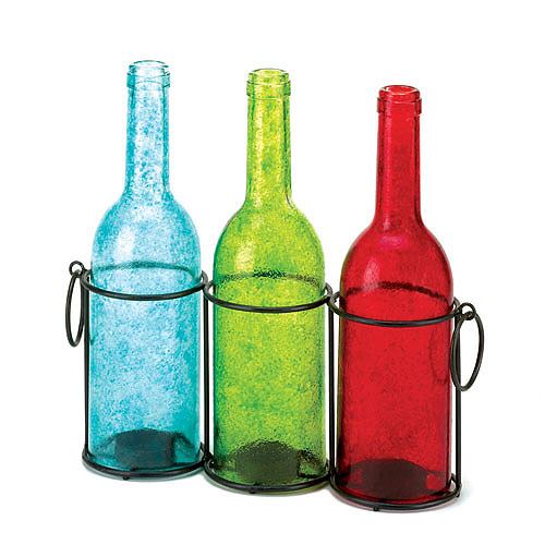 Carrington Trio Candle Holder **|**|** Set the night aglow in sparkling candlelight and dazzling color with this fantastic iron and glass display. The black iron framework features three tall glass bottles in red, blue and green that will make the flickering flames of your candles come to life with stylish color.Description Details Item weight: 2.8 lbs.Product Dimensions: 11 x 3-1/4" x 10-1/2" high; each bottle is 3" diameter x 10-3/8" high.Product Material: Iron and glass.UPC Code: 849179020811.Packaging: 1 SET"