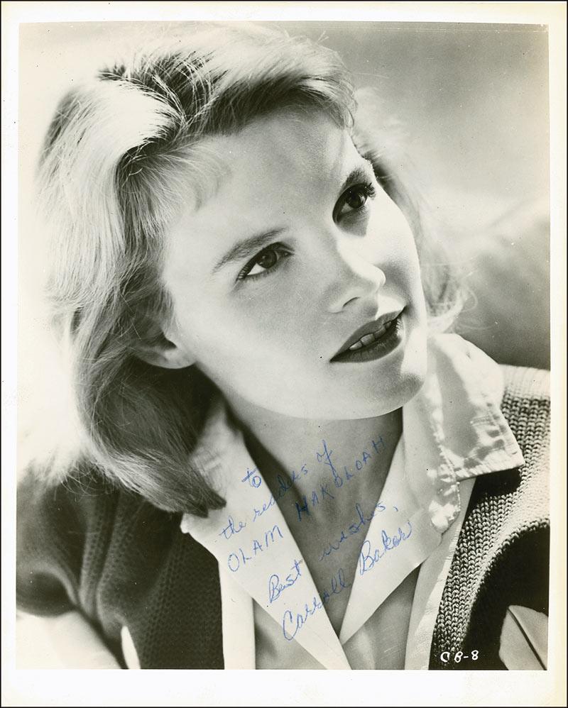 Glossy 8 x 10 photo, signed and inscribed in blue ballpoint “To the readers of Olam Hakoloah, Best wishes, Carroll Baker.” Scattered edge and corner creases, postmark surface impression, and light skipping to signature and inscription, otherwise fine condition.