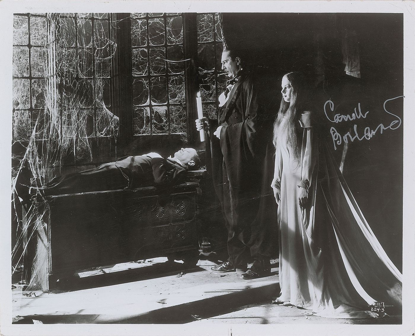 Glossy 10 x 8 photo of Borland standing beside Bela Lugosi in the 1935 film Mark of the Vampire, signed in silver ink by Borland. In very good to fine condition, with scattered light creasing, and a heavier diagonal crease.