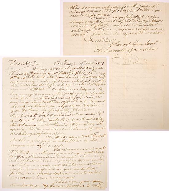 Carroll, Charles (1737-1832) Signer of the Declaration of Independence; member of the Continental Congress. He was the only Catholic Signer and the last surviving Signer. Autograph Letter Signed "Ch. Carroll of Carrollton," 1½ pp (one sheet) with integral address leaf, Baltimore, Nov. 18, 1825. The 88-year -old Carroll writes in a tremulous hand about financial matters to David F. Brice in Annapolis, discussing how to handle various debts. In the case of William Nichols, whose property Brice had "distrained." Carroll says, "I believe Nichols to be an honest man…will sell the articles, particularly the tobacco…and apply the proceeds…to the discharge of his debt…. " He closes by discussing the benefits of plaster, "I know it is too light for wheat, but plaster will stiffen the soil, improve it by producing clover…." Fine.