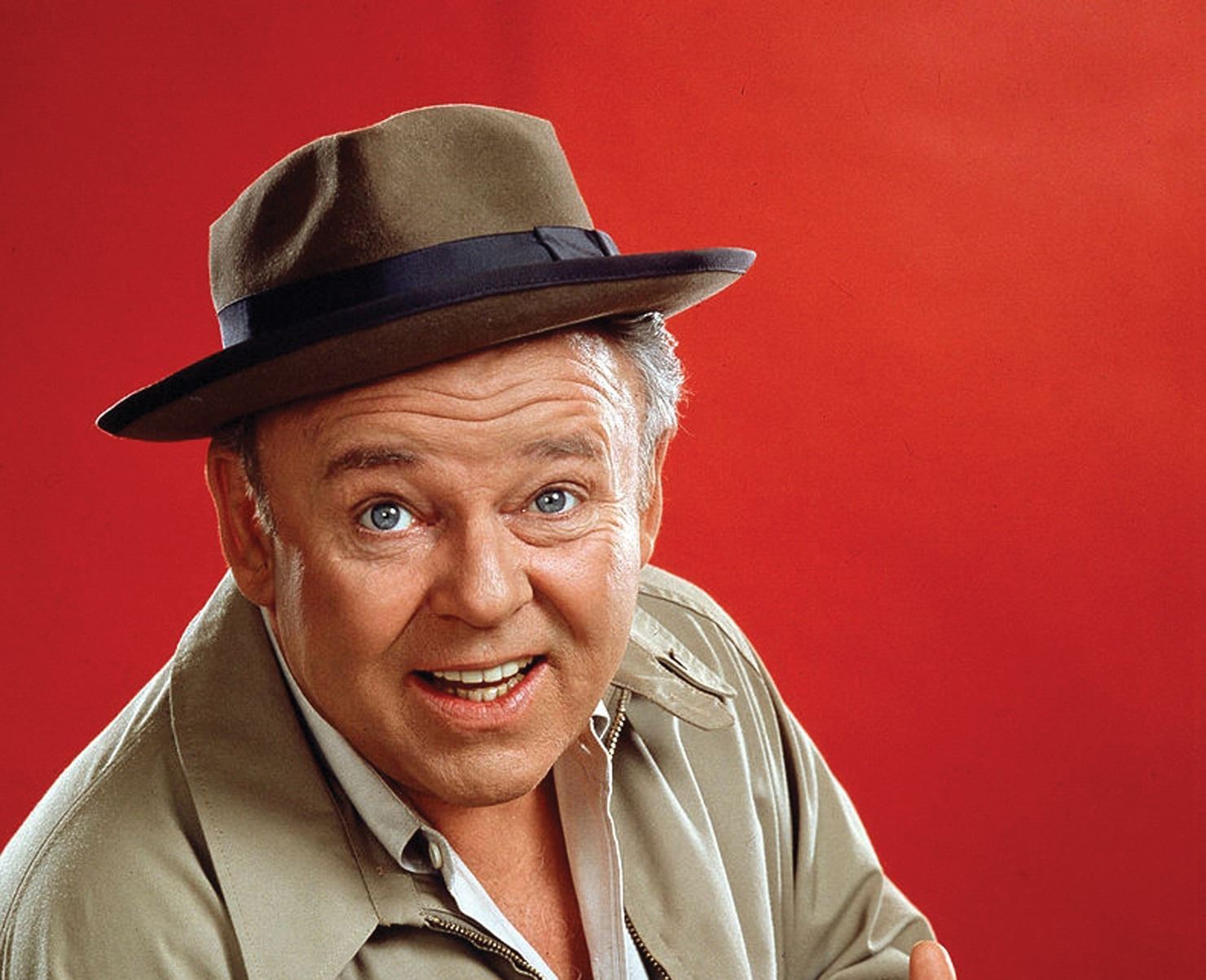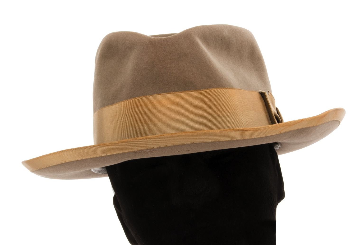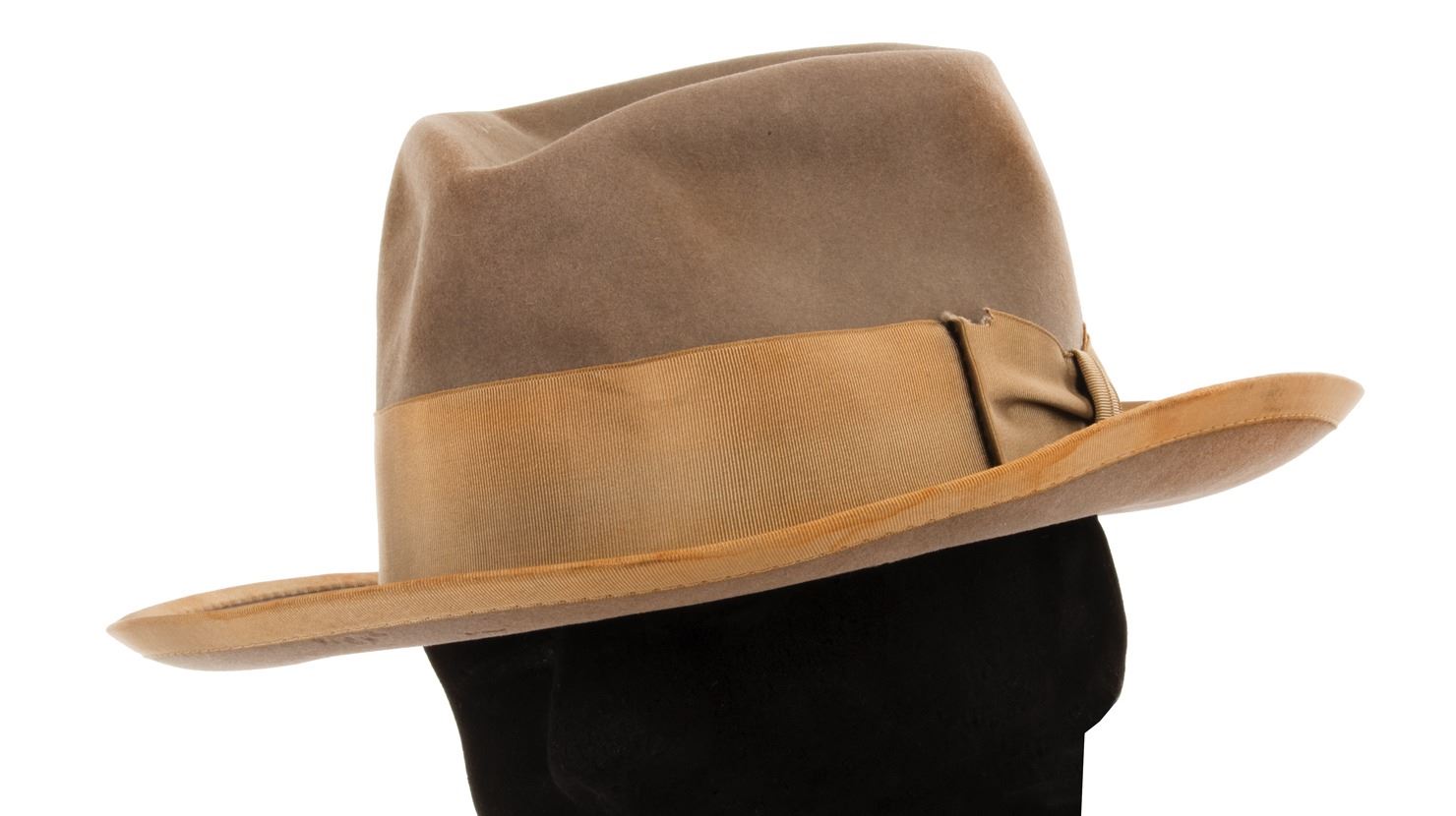 110. Carroll O'Connor "Archie Bunker" hat from All in the Family. (CBS-TV, 1971-79) Vintage original dove gray felt signature fedora with pewter grosgrain, wide hatband and bow, and matching piping around the brim. Retaining studio paper interior tag handwritten, "C. O'Connor" as well as multiple CBS inkstamps. Handwritten, "C.C." and "Size 7 1/8" on the interior. Another O'Connor hat from this seminal sitcom is in the collection of the Smithsonian Museum. Exhibiting age, production wear In vintage very good condition. Provenance: Profiles in History, Auction 16, July 31, 2003, Lot 18. $3,000 - $5,000