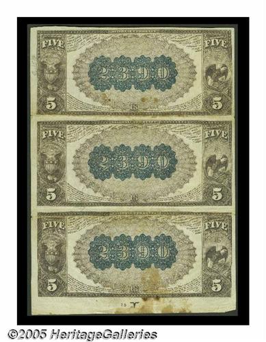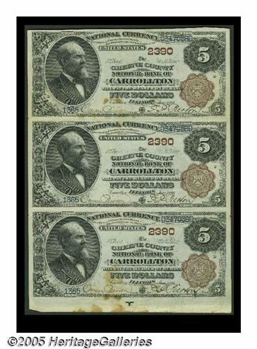 <B>Carrollton, IL</B></I> - $5 1882 Brown Back Fr. 477 <B>The Greene County NB</B></I> Ch. # 2390 Uncut Strip of Three<BR>An uncut strip of three $5 Brown Backs consisting of the "B," "C," and "D" position notes on the sheet. There are folds between the notes and a few from storage as well, along with a number of age spots which do detract, but there is plenty of eye appeal as well for this most interesting item. <B>Extremely Fine+.</B></I>