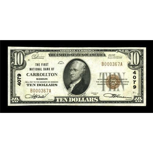 <B>Carrollton, MO</B></I> - $10 1929 Ty. 1 <B>The First NB</B></I> Ch. # 4079<BR> A lovely note which is far nicer than any example from here we've seen for sale in recent years. Bright <B>Extremely Fine.</B></I><BR><BR><b>Shipping:</b> Coins & Currency (<a target="_blank" href="http://www.heritageauctions.com/common/shipping.php">view shipping information</a>)