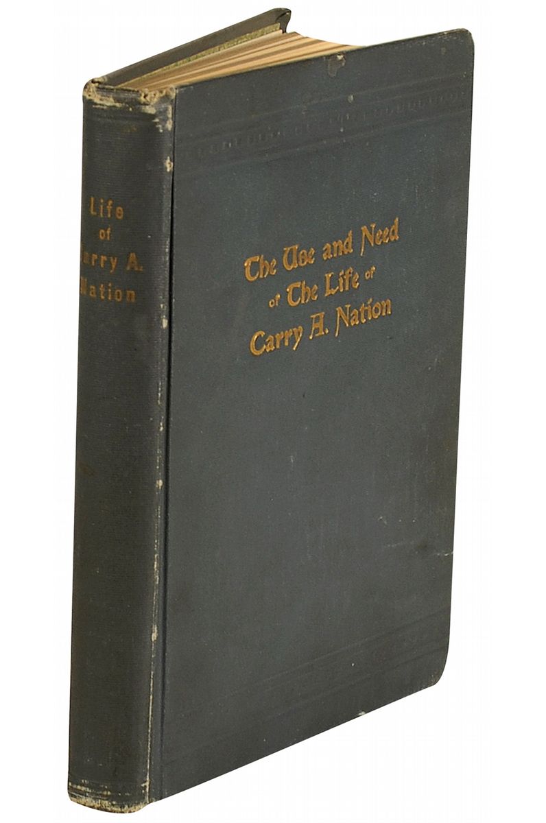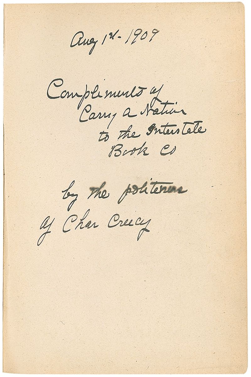 Temperance agitator, she was known for smashing saloons with a hatchet. Exceptional Signed book: The Use and Need of the Life of Carrie A. Nation. Later printing. Topeka: F. M. Stevens and Sons, 1909. Hardcover, 5.5 x 8, 414 pages. Signed on the second free end page, “Aug 1st 1909, Compliments of Carry A Nation to the Interstate Book Co by the politeness of Char Creecy.” In very good condition, with light toning to signed page, pencil notation to last free end page, spine a bit loose, and scattered wear and fraying to covers and spine.